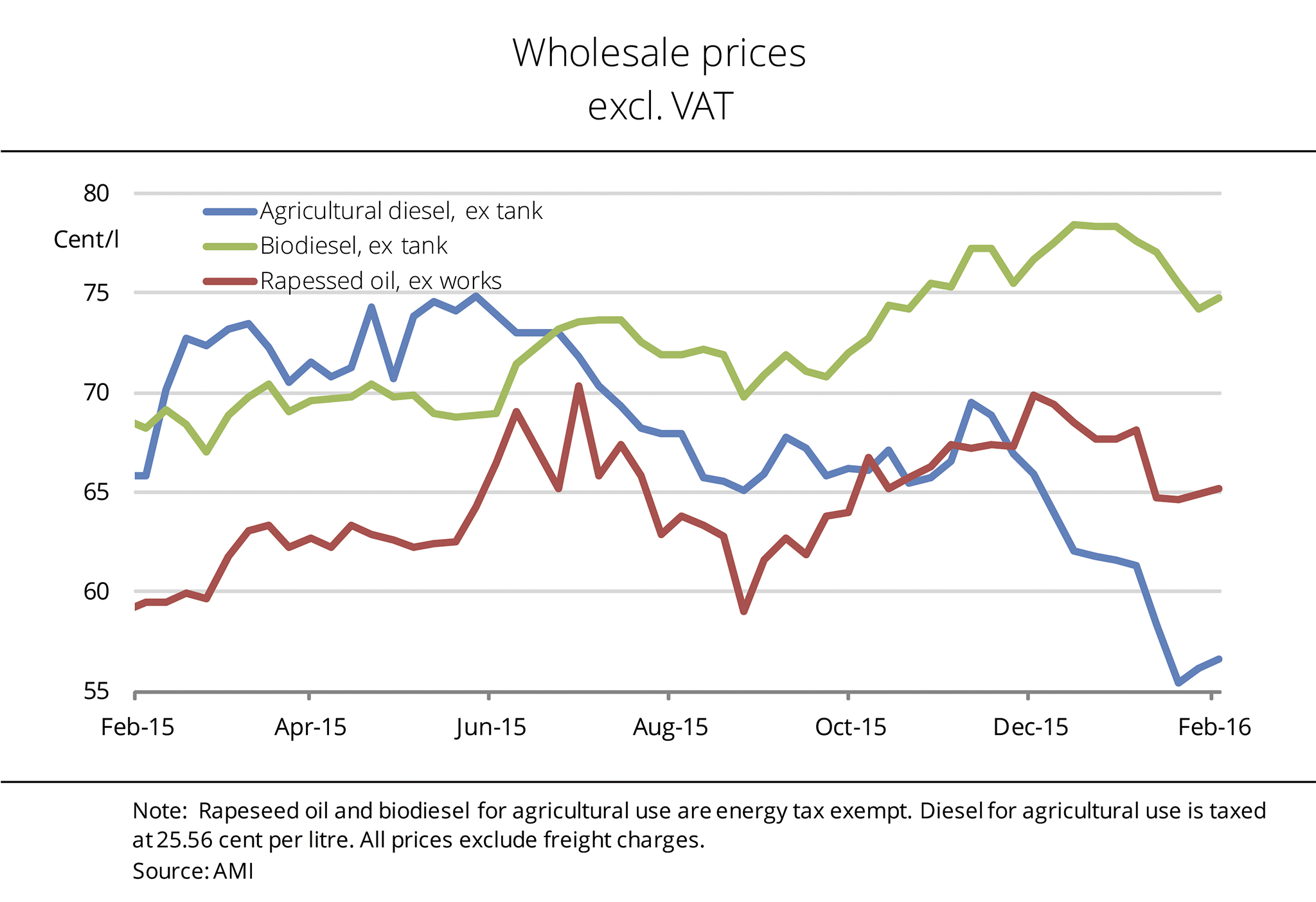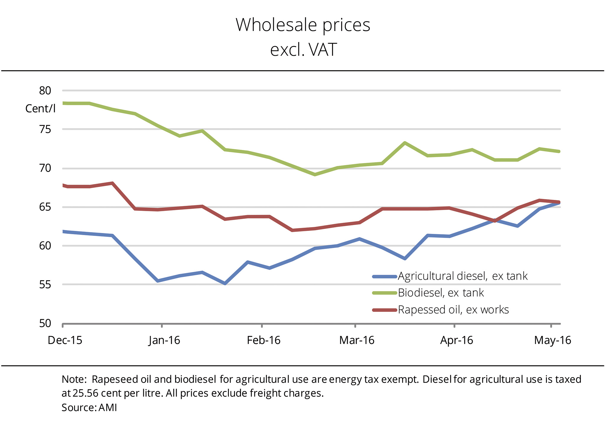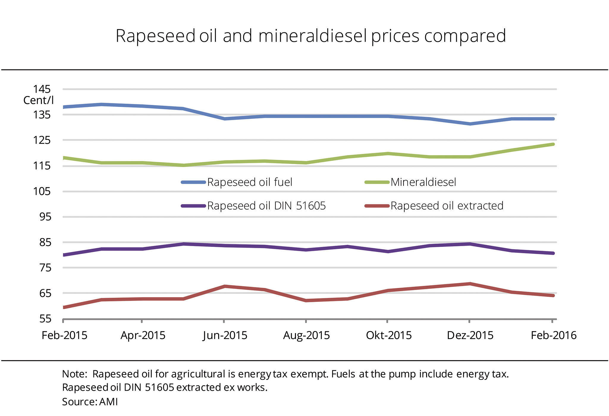 Weak crude oil prices keep the prices for mineral diesel at a low level, and consequently also those for agricultural diesel. Meanwhile, biodiesel prices surged from the previous year based on rising feedstock costs. At the beginning of February 2016, the wholesale price for mineral diesel was around 31 euro cents per litre, excluding energy tax. According to Agrarmarkt Informations-Gesellschaft mbH (AMI), this translates to a drop by virtually 10 euro cents per litre from February 2015, to an eleven-year low. Taking into account reimbursements to farmers, agricultural diesel currently costs around 57 euro cents per litre, 18 euro cents per litre less than tax-advantaged biodiesel.