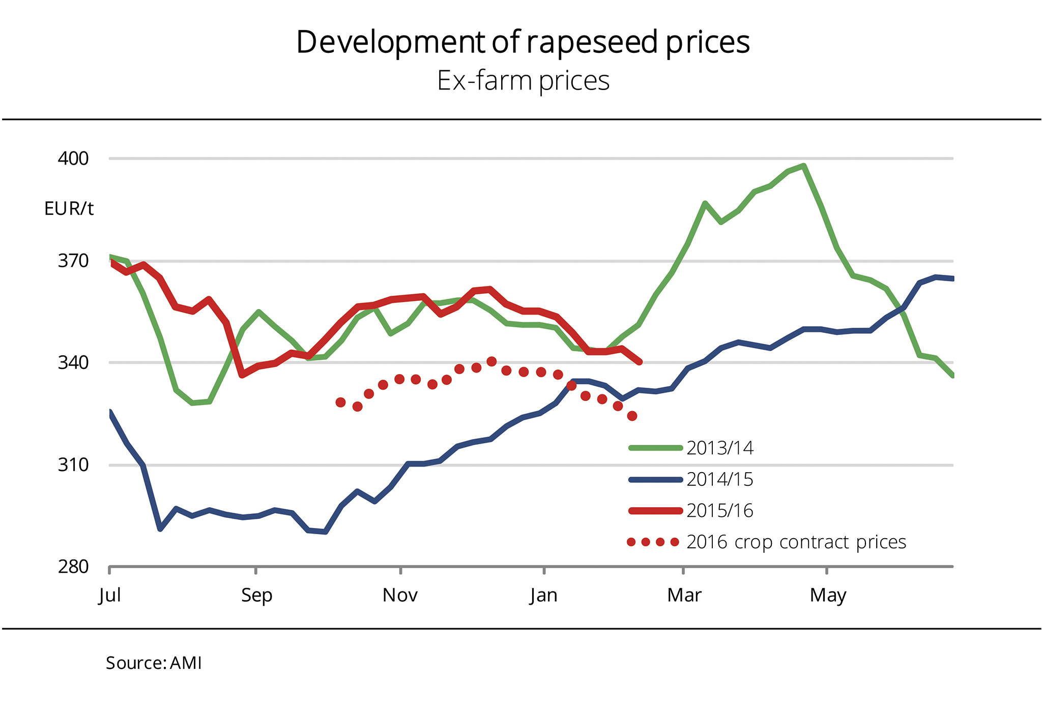 Cash market prices for rapeseed barely maintained the price gap against the previous year. Prices buyers currently pay for the upcoming crop are even below the year-ago level. The massive decline in crude oil prices and the temporarily firm euro sent rapeseed prices in Paris plummeting to the lowest level in five months at the beginning of February 2016. The price slide also put massive pressure on spot prices, especially because processors do not provide any incentives to thwart it, given the premiums they pay on stock market quotes. At the same time, producers hardly offer any batches, hoping that prices will rise significantly towards the end of the season. The 2016 crop is also rarely a topic of conversation. Producers obtained EUR 340 per tonne free storage facility for spot material in mid February, Agrarmarkt Informations-Gesellschaft mbH (AMI) reports. This was down EUR 4 per tonne from a week earlier and, consequently, up EUR 8 from the previous year. Buyers most recently accepted to pay EUR 323 per tonne for new-crop rapeseed, EUR 4 per tonne less than the same time a year ago.