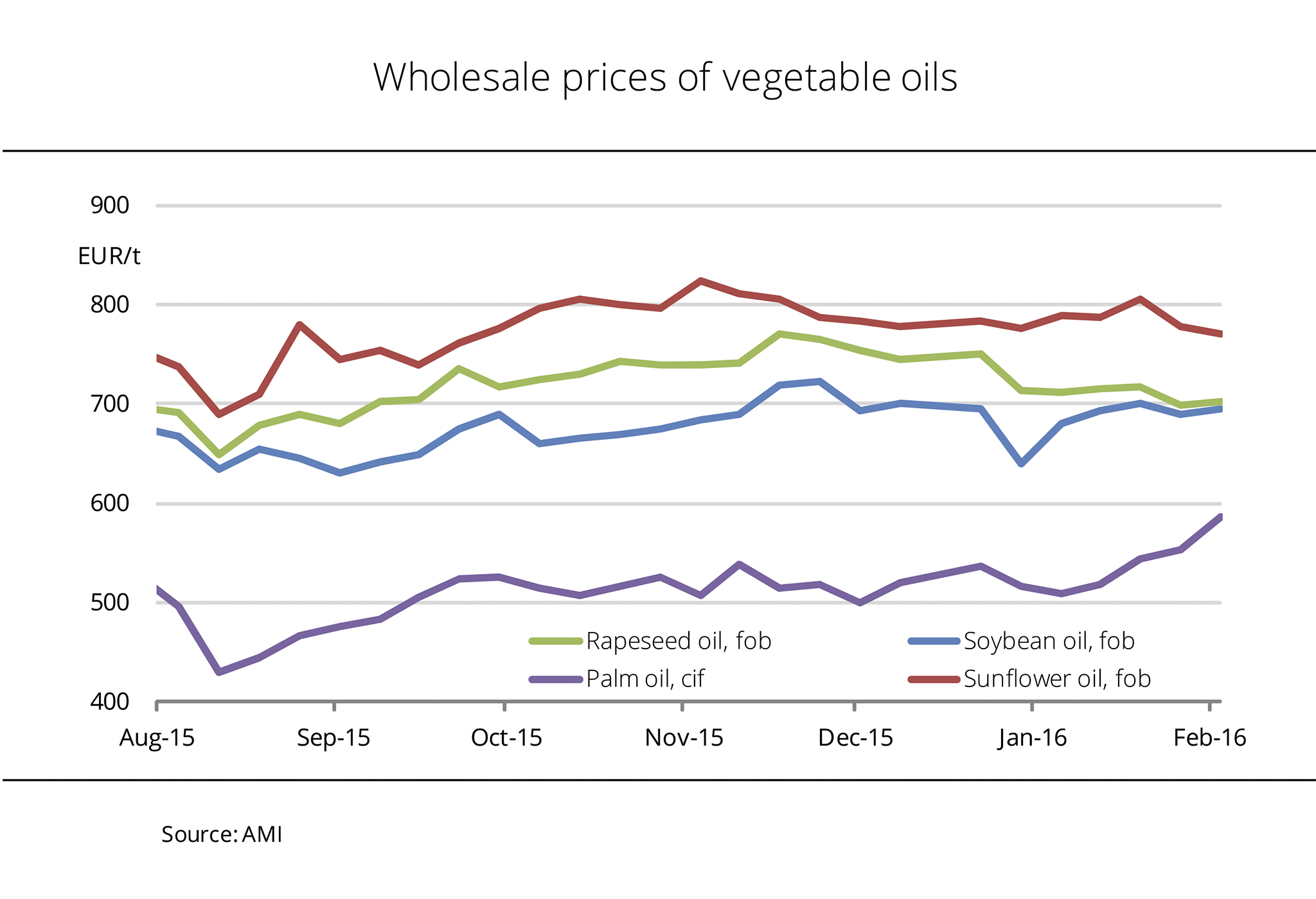 Prices for rapeseed and soybean oil are converging again. Palm oil continues to be low-priced, but the price gap against the other vegetable oils has narrowed significantly in the wake of the past few weeks' sharp price rise.Prices for soybean oil have returned to almost the level of rapeseed oil prices following their surge on the European vegetable oil market mid February 2016. The rise was based on firming feedstock prices in Chicago. At EUR 702.50 per tonne, rapeseed oil for nearby delivery fob Hamburg most recently only cost EUR 6.50 per tonne more than soybean oil. Palm oil prices also moved considerably closer to those of rapeseed, reflecting their past weeks' nearly ten per cent surge. At recently EUR 116 per tonne, the palm oil to rapeseed oil spread has narrowed by half since the beginning of the year. The palm oil price rally has been driven by prospects for limited supply in the most important palm oil producing countries in 2016 due to poor growing conditions caused by El Niño. These expectations temporarily sent palm oil prices in Kuala Lumpur to a 21-month high.
