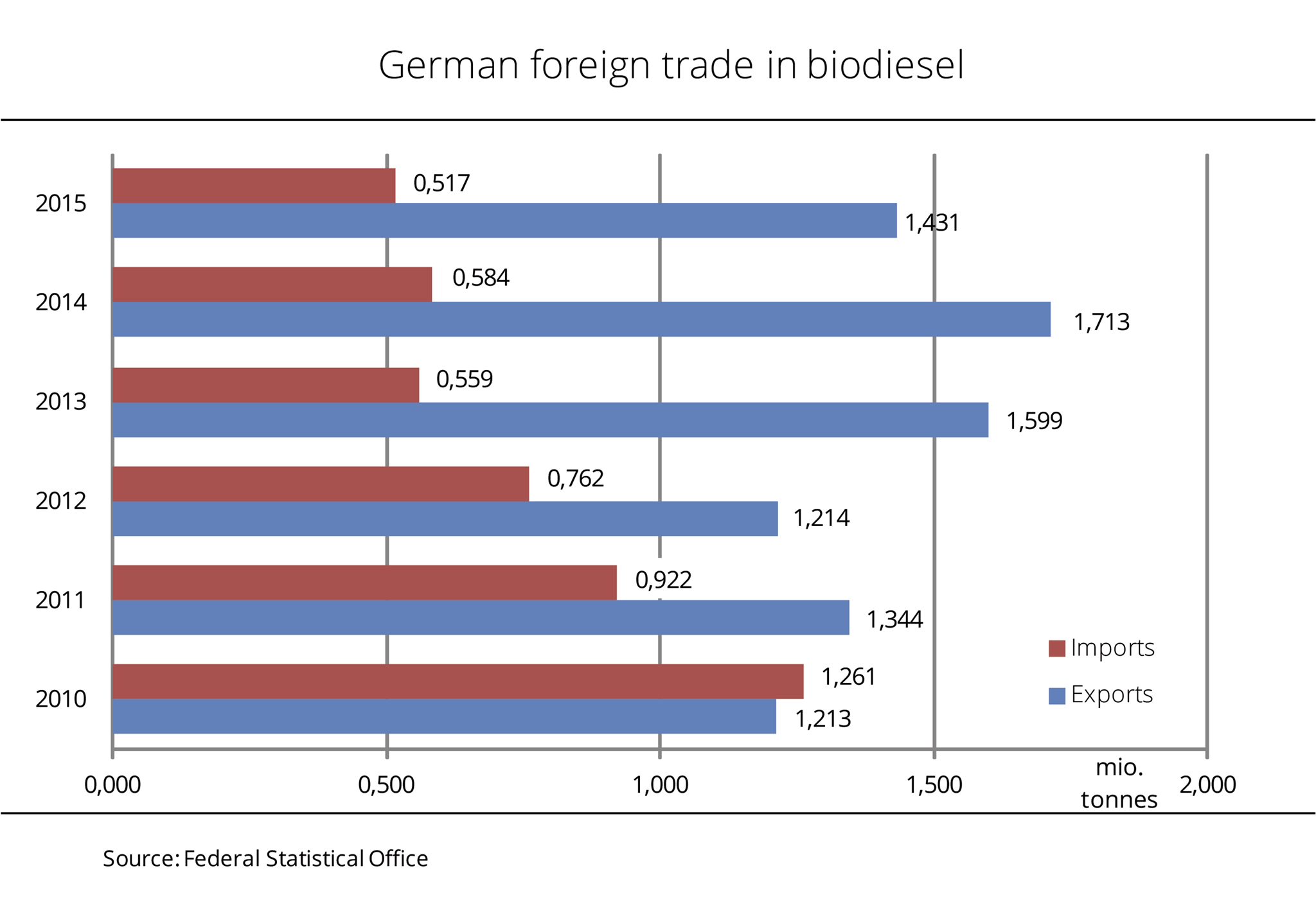 Although German foreign trade in biodiesel was not quite as brisk in 2015 as a year earlier, export figures published by the German Federal Statistical Office verify that interest in biodiesel from Germany continued to be high. German 2015 biodiesel exports amounted to just over 1.43 million tonnes. Consequently, exports were down 16 per cent from the 2014 record, but still exceeded the long-term mean. Just under 90 per cent of deliveries traditionally went to EU member states. Above all, the Czech Republic and Sweden ordered more than usual, whereas top recipients such as the Netherlands, Poland and France imported less. According to the German Federal Statistical Office, Norway was the most important third country, importing almost 128,000 tonnes. This translates to a virtually 50 per cent rise from a year earlier. At the same time, German demand for foreign biodiesel dropped by approximately 11 per cent, to 517,000 tonnes. This was to the lowest level on record, Agrarmarkt Informations-Gesellschaft (mbH) reports. Malaysia supplied 132,000 tonnes, just over one third more than in 2014.