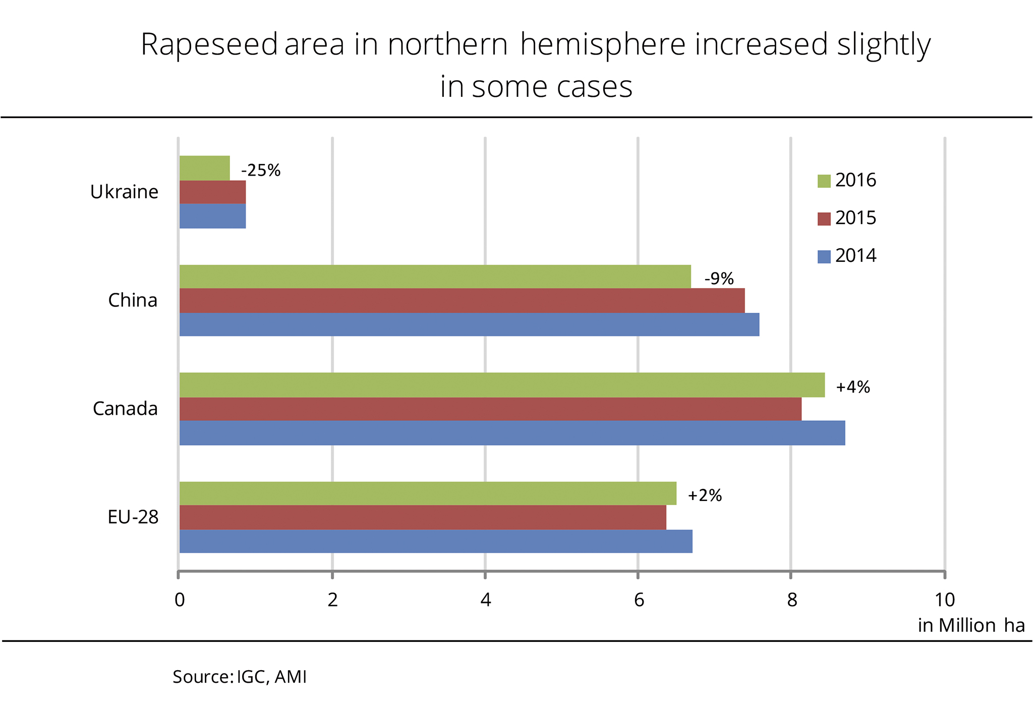 In the northern hemisphere, winter rapeseed has been in the ground for months. Now, it shows how the crops made it through the winter. Only in a few regions suffered larger than usual damage this year. In some countries, even planting was ill-fated. Above all, a sharp drop in rapeseed area is forecast for Ukraine in 2016. Drought severely affected plantings and is also responsible for above-average losses over the winter. According to information published by Agrarmarkt Informations-Gesellschaft (mbH), the Ukrainian rapeseed area may potentially be down one fourth from a year earlier. Some failed areas will be re-planted with summer rapeseed. However, yields of summer rapeseed are lower than those of winter rapeseed. In Poland, the cold winter resulted in more winterkill losses than usual. In Great Britain, the crops suffered from flooding. Nevertheless, the area of winter rapeseed is forecast to expand across the EU. In China, the area planted with rapeseed will probably be reduced because rapeseed is less competitive than other crops. For exactly the opposite reason, the area of summer rapeseed in Canada is projected to rise.