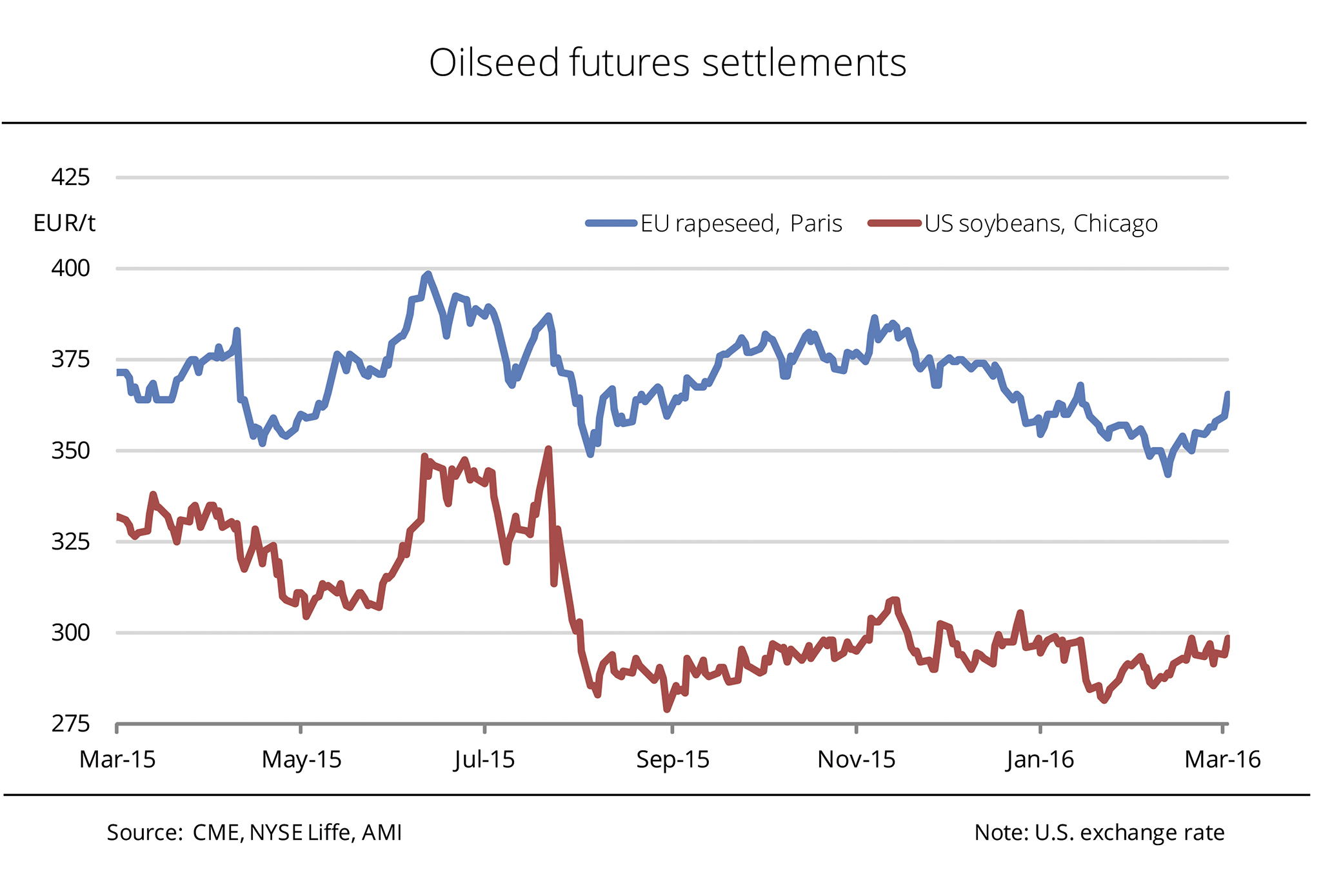 Early this year, the quotes for rapeseed in Paris registered heavy losses in the wake of weak crude oil prices and a stagnant market. Currently, an upward trend is looming on the horizon, driven by firm soybean and vegetable oil prices. Harvest delays in South America caused by poor weather and buoyant demand for US material have sent soybean profits leaping in Chicago in March 2016. The nearby surged by just over 7 per cent over the month, exceeding the mark of USD 9 per bushel (the equivalent of EUR 295 per tonne) for the first time since December 2015. Rapeseed in Paris also benefited from the upswing of soybean prices, hitting a six-week high in contracts for both the 2015 crop and the upcoming crop. Even a firm euro rate did not prevent the rise, Agrarmarkt Informations-Gesellschaft (mbH) reports. Rapeseed prices received additional stimulus from the fact that the competitive advantage of rapeseed oil increases as vegetable oil and crude oil prices are on a general rise.