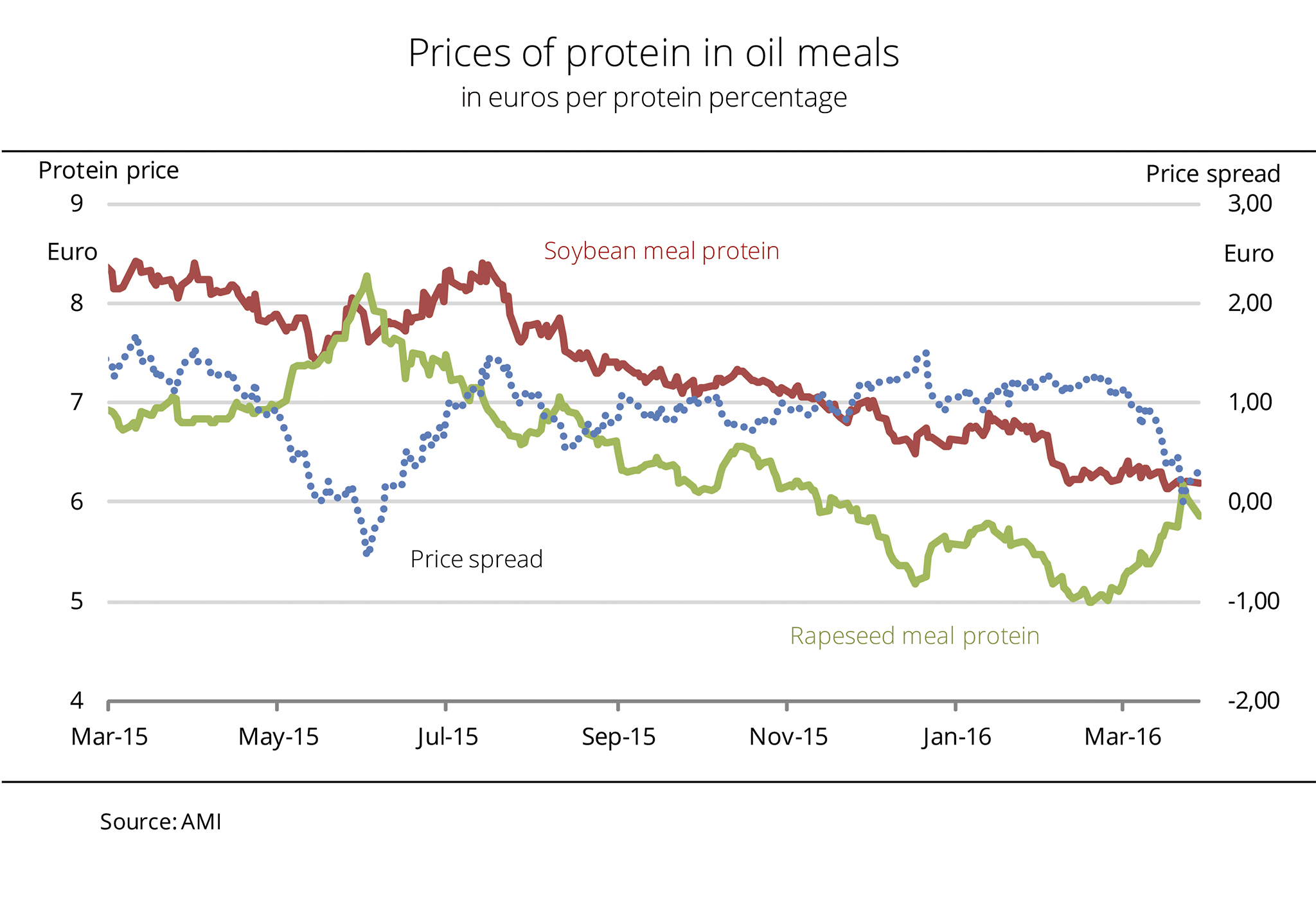 Temporarily very keen interest in buying nearby material and firm feedstock prices in Paris have driven up prices of rapeseed meal substantially at the end of March 2016. Meanwhile, soybean meal prices remained at a fairly low level. Prices for rapeseed meal climbed to almost EUR 6.20 per protein percentage per tonne last week. Consequently, they not only hit a five-month high, but also reached the price level of soybean meal protein. Above all, the growing demand in the run-up to the holidays sent prices for nearby positions rising. However, most orders were only for minimal amounts. According to information published by Agrarmarkt Informations-Gesellschaft (mbH), the sharp rise in prices quickly curbed buyer interest. As a result, the high price level could not be maintained as there was no shortage of supply. However, as breaks in processing are imminent and a large oil mill is set to close down, chances are that supply could shrink appreciably before long.