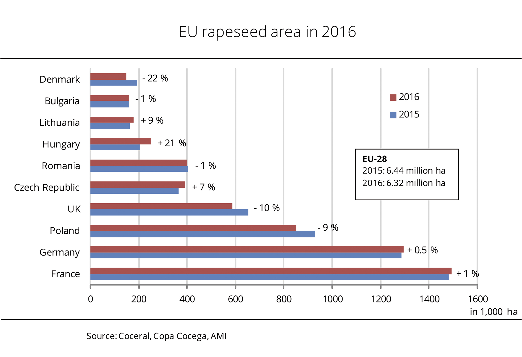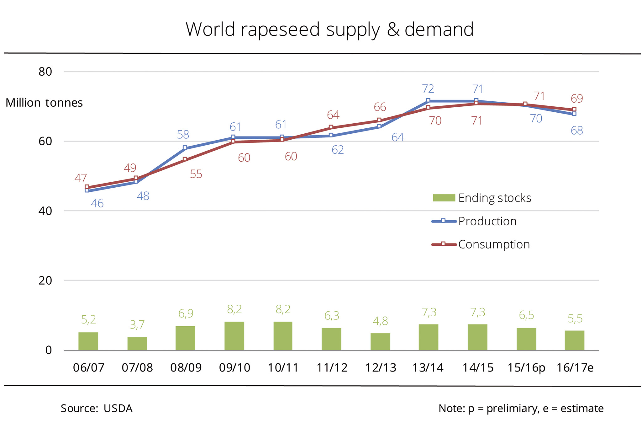 Global rapeseed consumption will clearly exceed production in the 2016/17 marketing year. This is likely to result in a decrease in ending stocks and changes in the flows of goods. According to USDA's December forecast, global rapeseed production in the 2016/17 marketing year is going to decline by around 3.5 per cent from the previous year to just under 68 million tonnes. According to information published by Agrarmarkt Informations-Gesellschaft mbH (AMI), rapeseed output is going to increase, in some cases significantly, in some countries, such as Australia or India, but the rise is not sufficient to offset the almost 10 per cent decline in both China and the EU-28. Since worldwide use of rapeseed oil remains unchanged while production is likely to drop by 3 per cent concurrently with rapeseed production, the global supply/demand balance for the 2016/17 marketing year is much tighter than a year earlier. Global rapeseed consumption is forecast to fall to just under 69 million tonnes, but the decline of 2.4 per cent is smaller than the drop in production. Consequently, rapeseed ending stocks are projected to shrink by more than 15 per cent to 5.5 million tonnes, which means that in terms of figures, global stocks would not even last for one month. AMI believes that due to scarce supply, farm prices are likely to remain attractive until the next harvest.