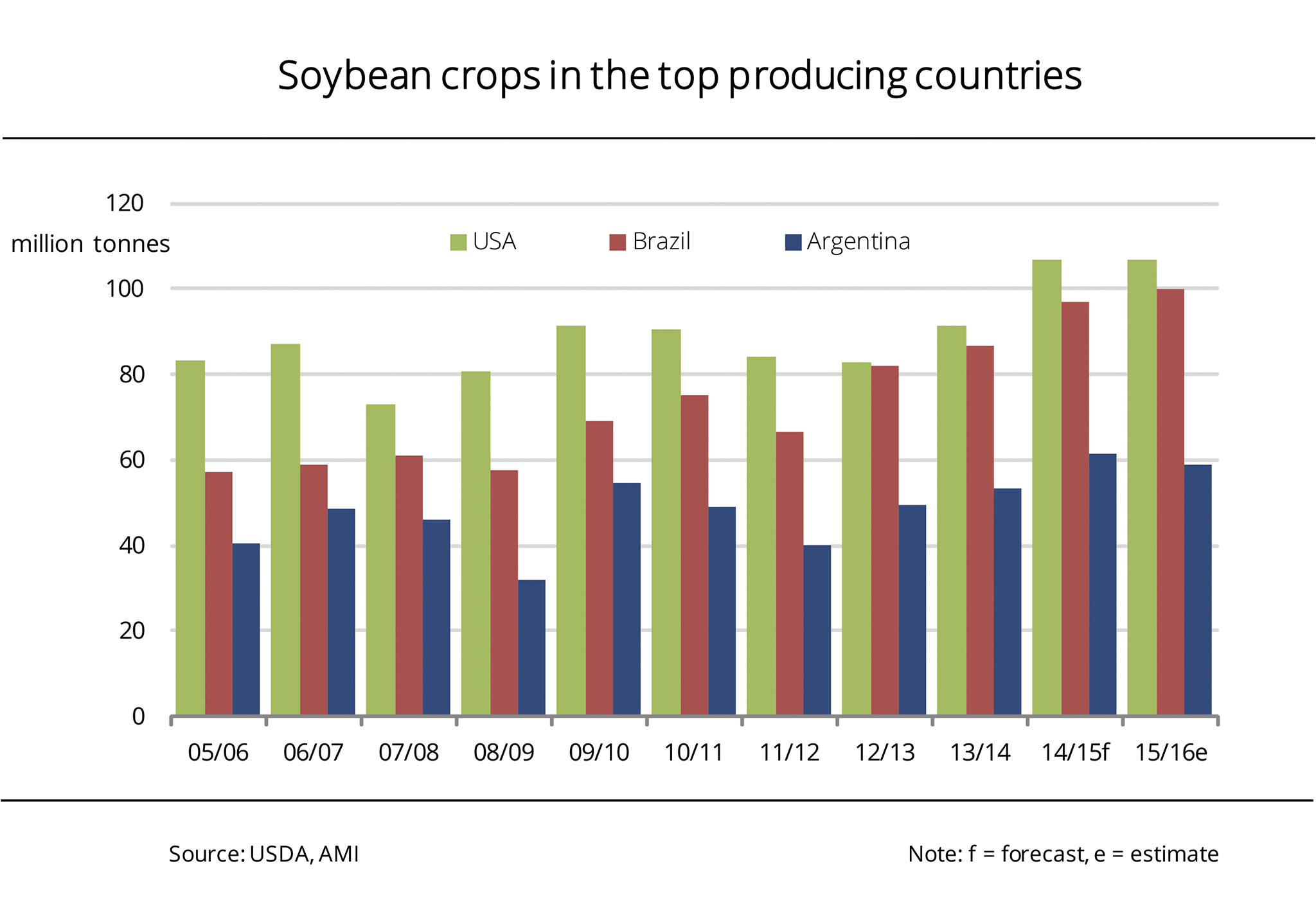 The 2015/16 South American soybean production could be much smaller than has long been expected because of weather-induced losses in Argentina. In Brazil, harvest figures more or less match forecasts as the harvest is coming to a close. Several days of heavy rain in Argentina might result in harvest losses of up to 3 million tonnes, in addition to reducing soybean quality. USDA has recently put the 2015/16 Argentinian soybean production at 59 million tonnes, down approximately 2 million tonnes from 2014/15. Brazil is expected to produce a record crop of 100 million tonnes. Almost 90 per cent of its soybean area has been harvested. The Brazilian crop compares to the (narrow) US record of 107 million tonnes in the autumn of 2015, diminishing the gap between the two countries. According to Agrarmarkt Informations-Gesellschaft (mbH), preliminary estimates for the upcoming year 2016/17 indicate another large soybean output. In other words, as matters stand, the US soybean area for the 2016 harvest will fall just short of the previous year's record.
