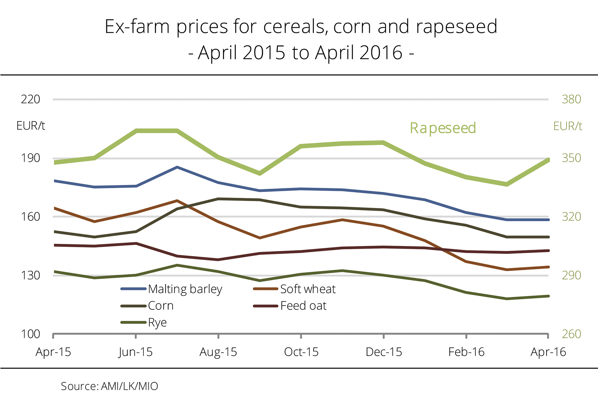 Farm prices of rapeseed are currently the only prices that are above the previous year's level. Meanwhile, cereals and corn saw a sharp dip. Following a strong rise over the past several months, April 2016 rapeseed prices not only shot up to the highest level since the end of 2015, but even climbed above the year-ago level. Consequently, rapeseed is currently the winner among the field crops, Agrarmarkt Informations-Gesellschaft (mbH) reports, because for all types of cereals as well as corn, farmers are receiving less money than at the same time a year ago. As supply exceeded demand, the price drop was especially strong for soft wheat, amounting to virtually 20 per cent. In contrast, fodder oat and corn saw a moderate dip of just under 2 per cent. April 2016 bids for rapeseed were on average EUR 349 per tonne ex farm, up just over EUR 1 per tonne from the same month a year ago.