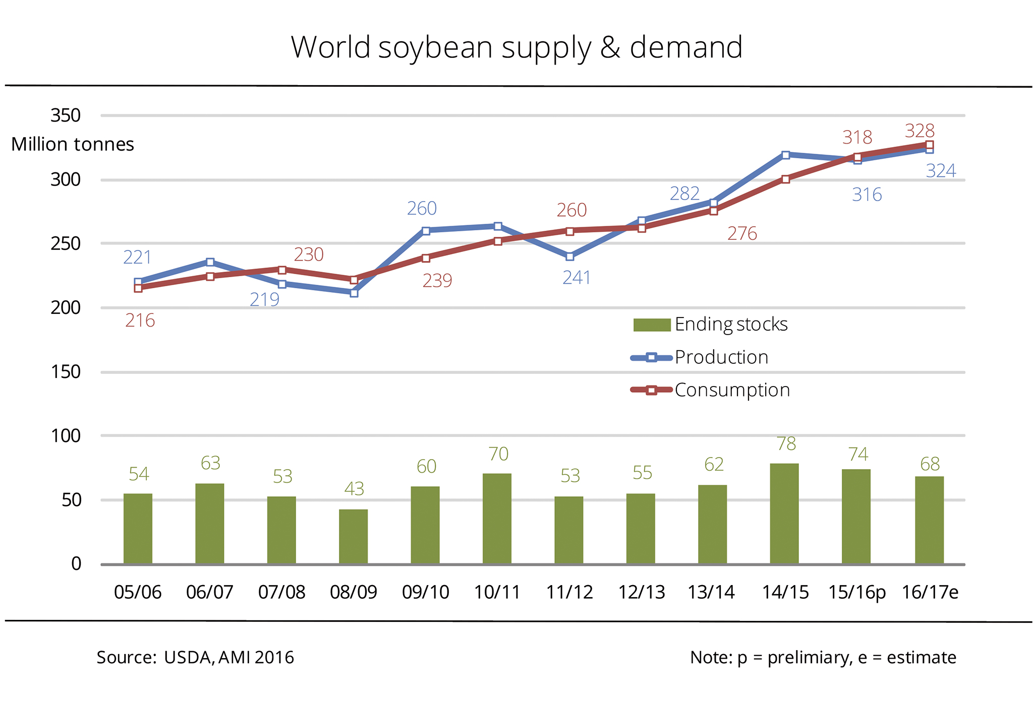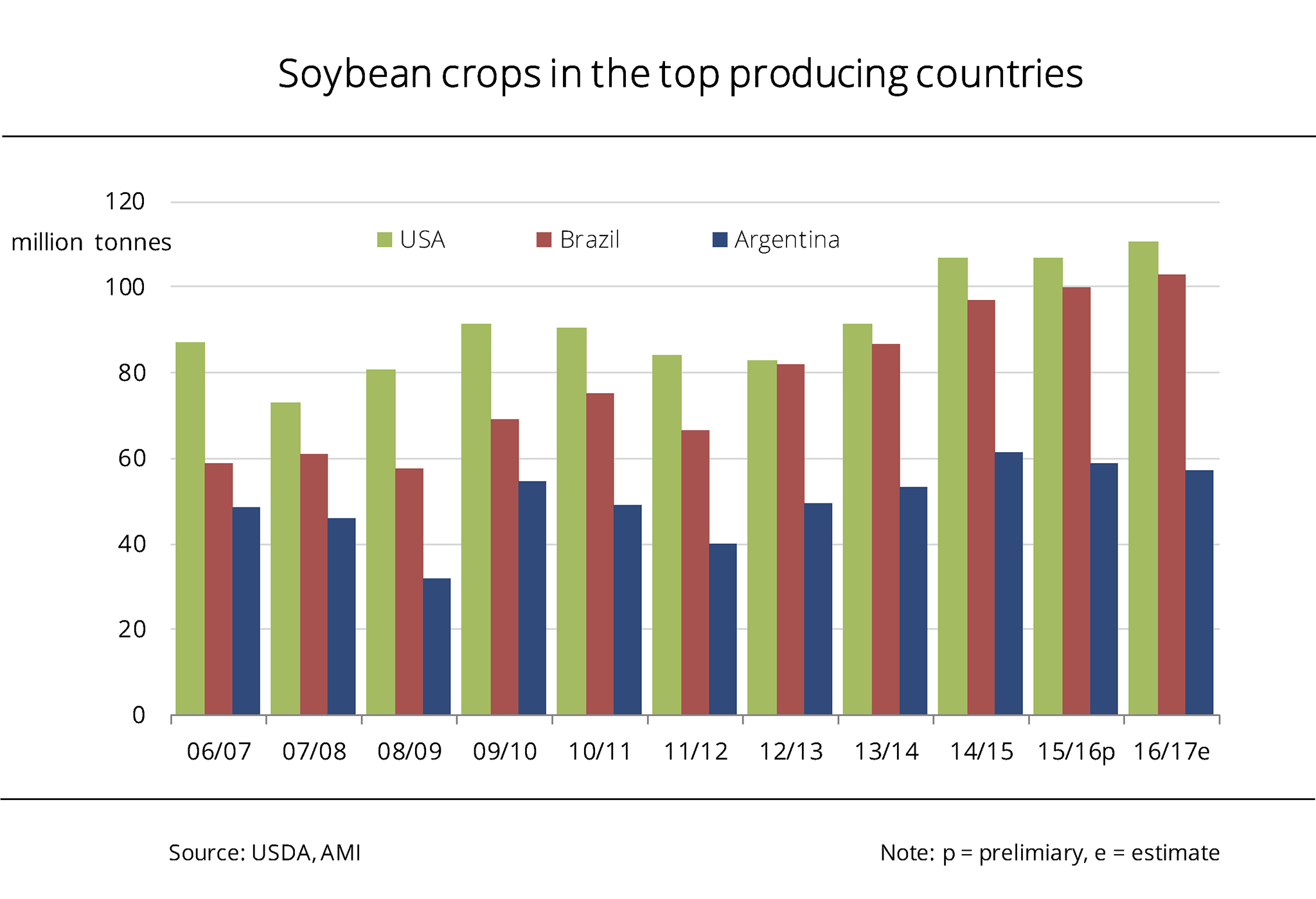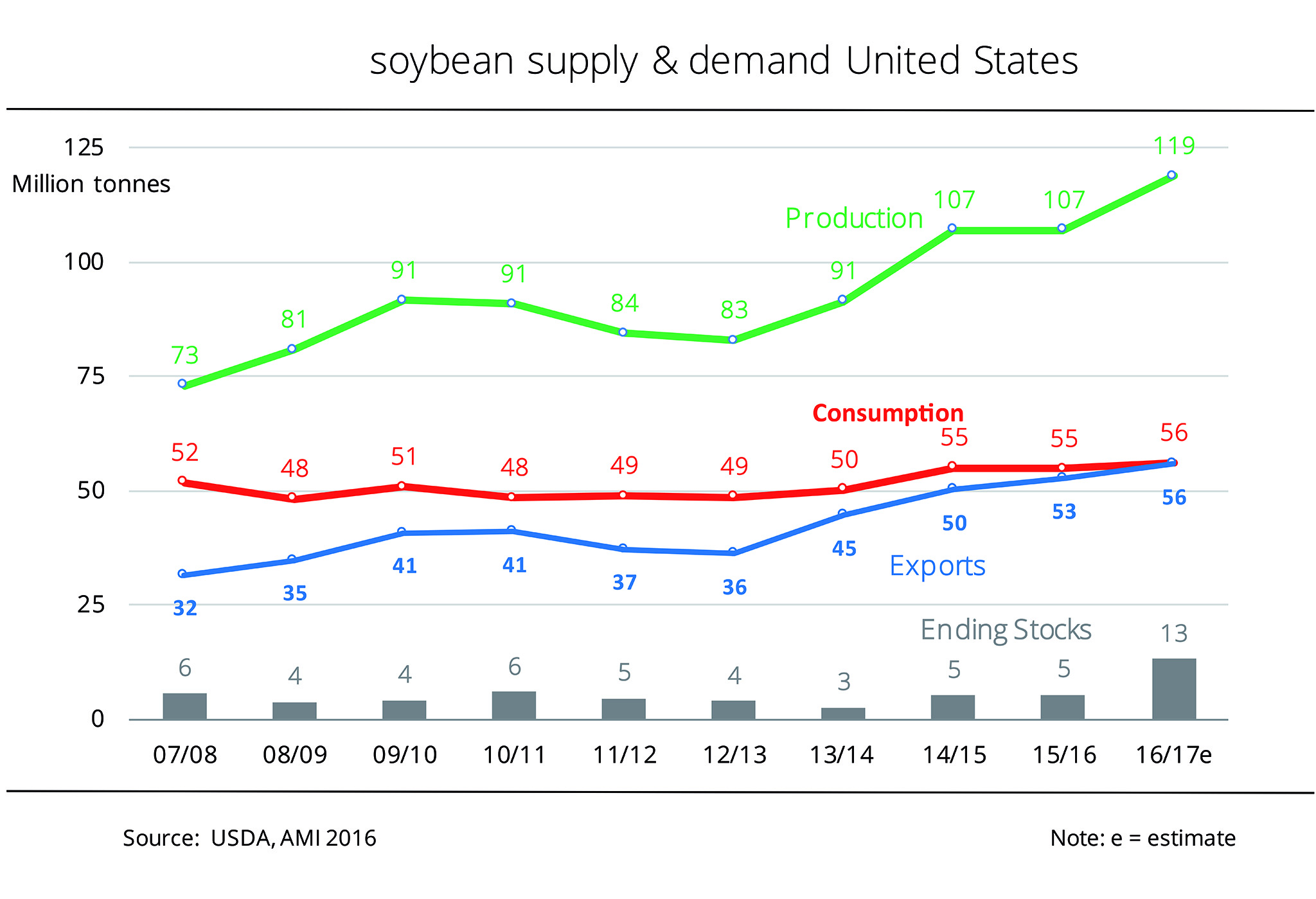 In the US, growing conditions for soybeans continue to be optimal. Fears of losses caused by drought are history now. The record area planted with soybeans could allow farmers to bring in the biggest ever soy harvest this autumn. The USDA forecast pegs this year's US soybean crop at around 110.5 million tonnes. This figure would exceed the 2014 record by 3.6 million tonnes. Favourable growing conditions, also in the development stage in August that is key in determining yield, have further improved prospects and led USDA to raise its recent crop forecast by 4.5 million tonnes. Since Brazil is also expecting a bumper crop of an estimated 103 million tonnes in the spring of 2017, global 2016/17 production could rise to unprecedented levels. According to Agrarmarkt Informations-Gesellschaft mbH (AMI), the strong downward pressure on US soybean prices could only be counteracted by very brisk demand. The latter is already on the horizon.