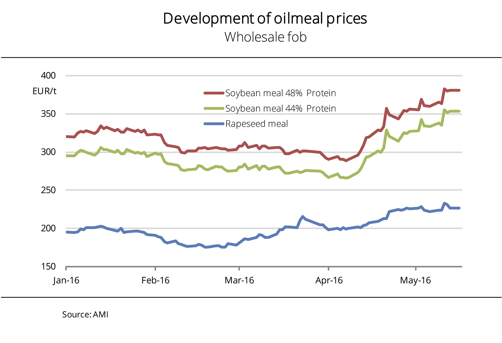 Prices for oilseed meals have soared over the past few weeks. The key driver was, first and foremost, the sharp rise in soybean prices. However, the sometimes tight supply also lent support to asking prices. Soybean meal is currently at its highest level since the end of July 2015. According to information published by Agrarmarkt Informations-Gesellschaft (mbH), wholesale prices for 44% soybean meal most recently overshot the level of EUR 350 per tonne, while high-protein meal (48%) was in excess of EUR 380 per tonne. The sharp upturn in prices, which started early April 2016, was primarily driven by the surge in raw material prices in response to the poor Argentine soybean harvest. Currently, what is driving prices up is the slow pace of sowing in the US. Consequently, soybean meal is also getting increasingly expensive. Buyers now hope that the boom will wane. However, the prospects for another tightness in global supply with declining ending stocks are likely to maintain prices at high levels for the time being. Rapeseed meal most recently exceeded the EUR 225 per tonne mark. Tight nearby supply has sent prices rising to a level last seen seven months ago.