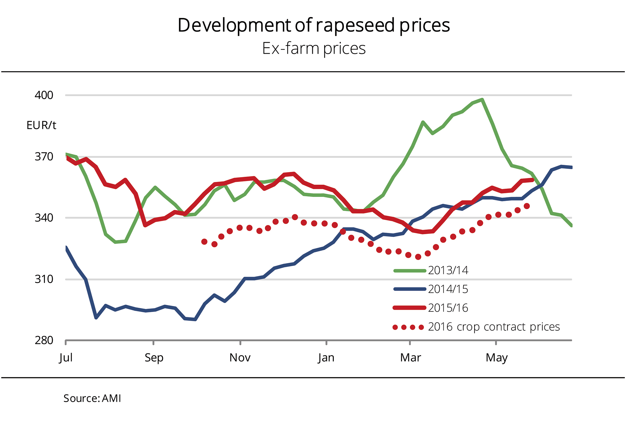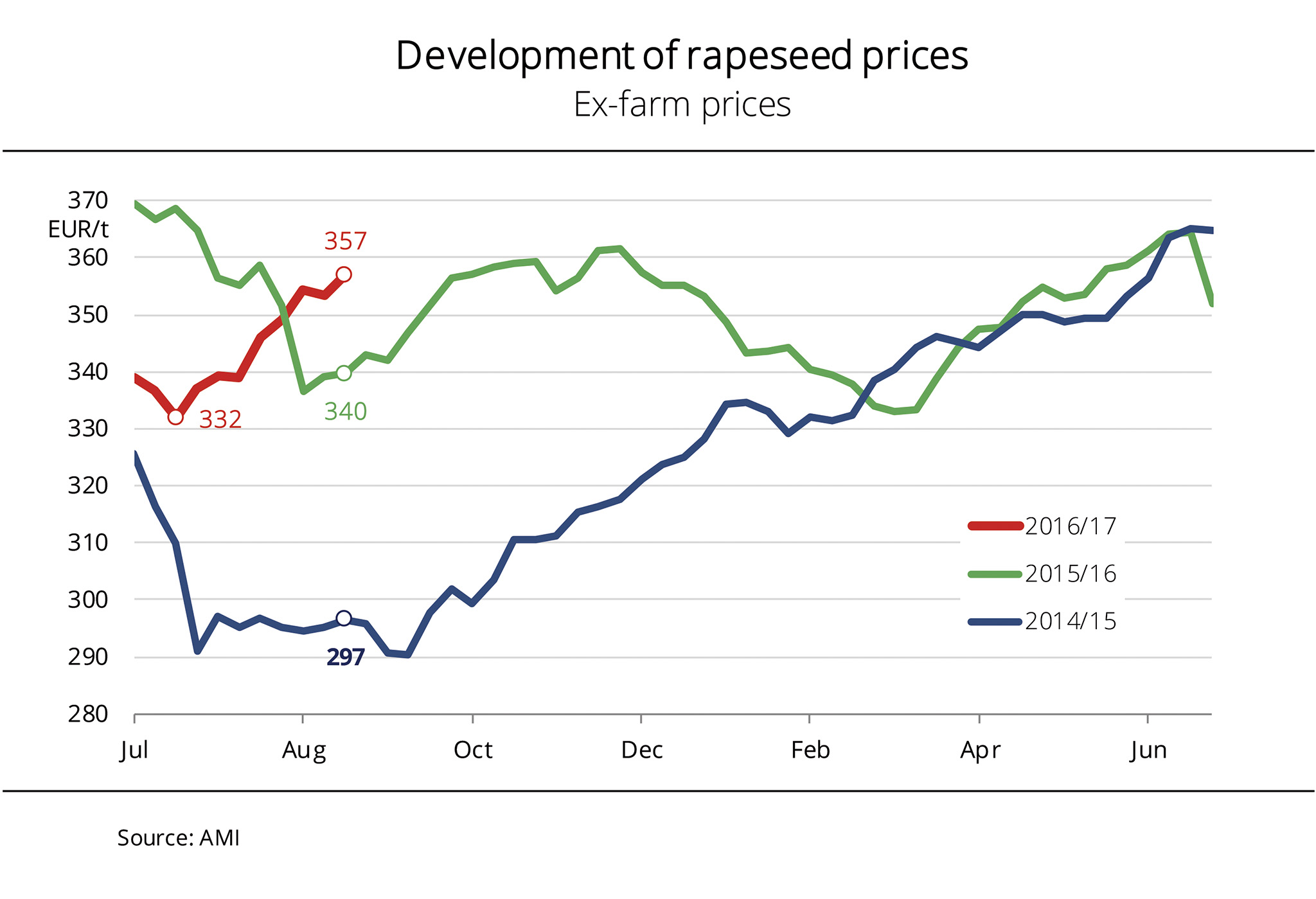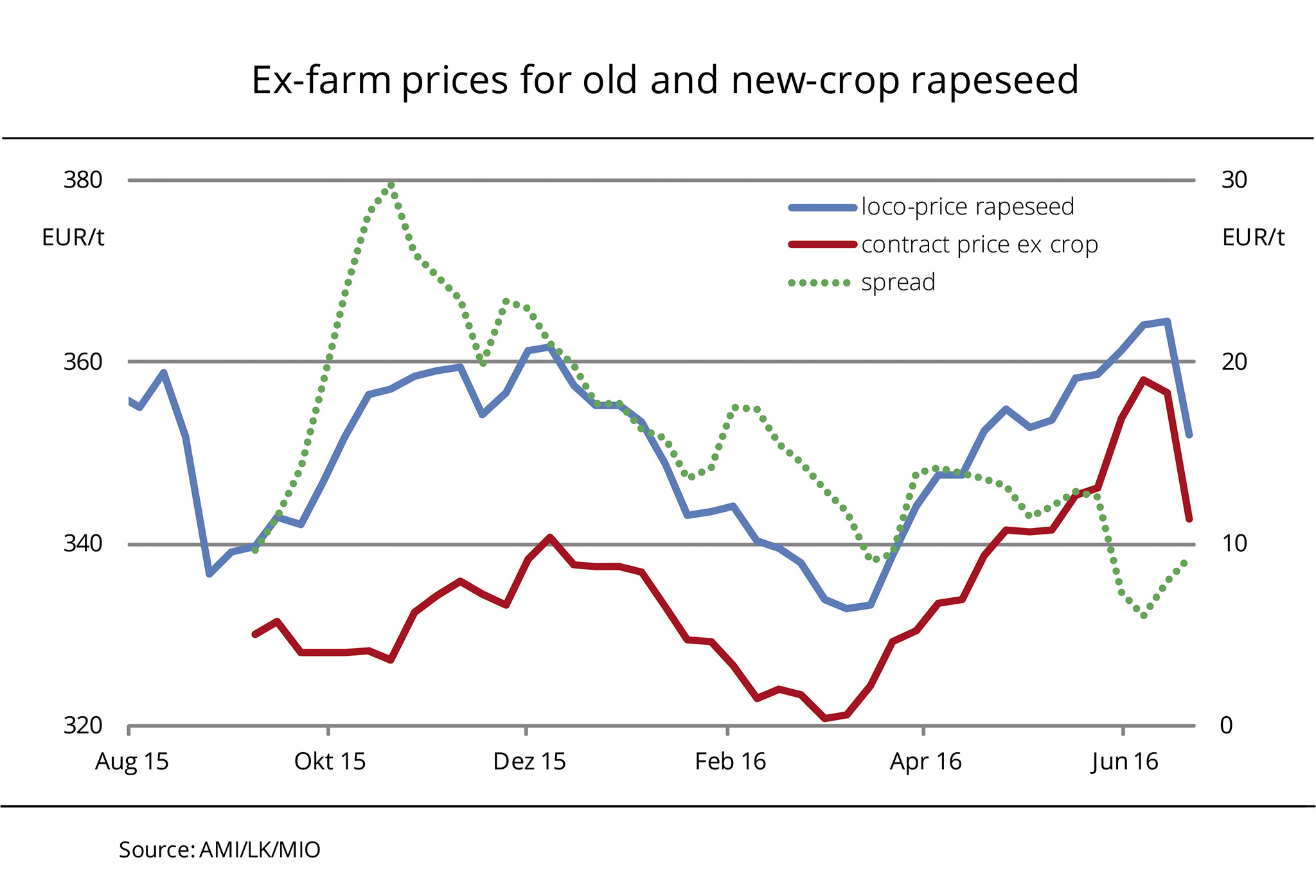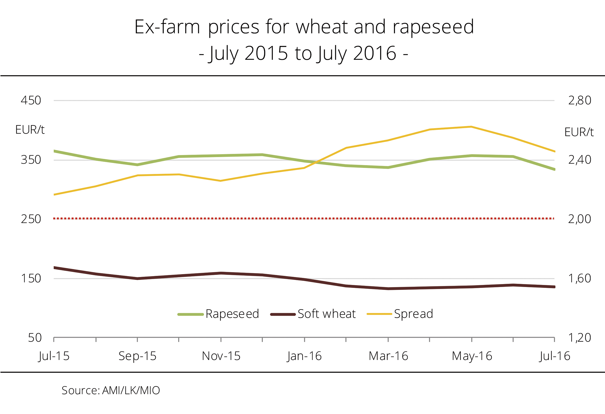 The price gap between rapeseed and wheat has widened at the end of 2015/16. As harvest pressure wanes, this trend could continue in 2016/17 because, due to poor weather, the EU harvest will be considerably smaller. The European grain and oilseed traders' association Coceral/Copa-Cocega estimates the 2016/17 EU rapeseed supply at 21.2 million tonnes, expecting it to be even tighter than the previous marketing year. The reason is weather-related declines in yield. Although wheat was also affected by the unfavourable weather, especially in May and June 2016, prospects for supply are significantly better as global production is expected to hit a record. Meanwhile, there is scope for upward price movements of rapeseed based on decreasing production both in the EU and worldwide. In other words, the reduced supply to the market will be reflected in prices this year too. Buyers paid around EUR 334 ex farm per tonne of rapeseed already in July 2016. This was just less than EUR 200 per tonne more than what they paid for wheat.