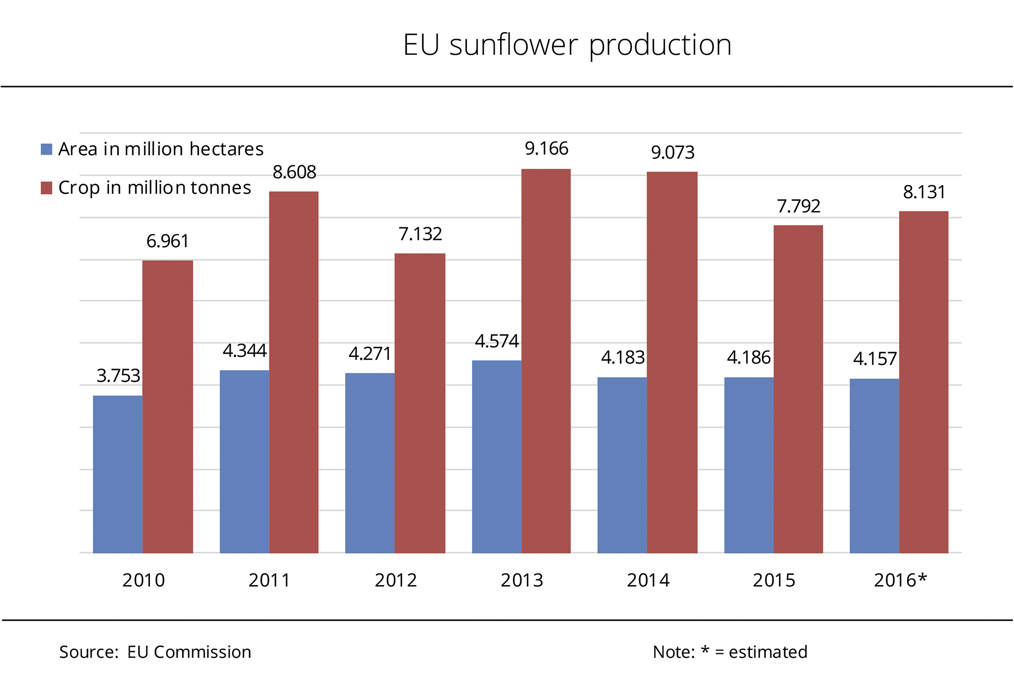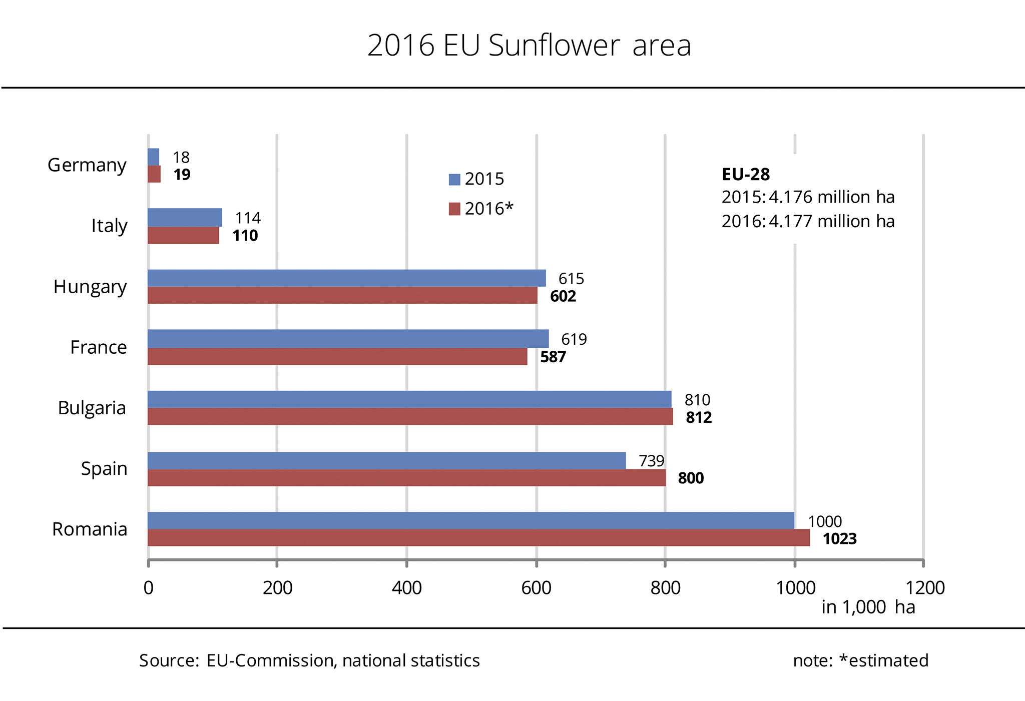 Despite a reduction in sunflower area, sunflower production in the EU-28 picked up from the previous year. In particular, the extensive production in Hungary accounts for the growth. According to current estimates, the 2016 production of sunflowerseed will likely outstrip the fairly average 2015 output. Although the area planted with sunflowers dropped slightly from a year earlier, harvest estimates exceed the previous year's figures throughout the EU. According to information published by Agrarmarkt Informations-Gesellschaft mbH, the EU Commission puts the 2016 sunflower area at around 4.16 million hectares, which is a minimal reduction of 0.7 per cent compared to the previous year. By contrast, the EU-28 sunflower harvest is currently forecast at 8.13 million tonnes, up 4.4 per cent from the year-ago level. The growth in output despite the reduction in area is accounted for by an increase in productivity. Compared to 2015, average yields rose by 5.4 per cent to just less than 20 decitonnes per hectare. The key reason for the increase in harvest and yield in the EU-28 is the rise in Hungarian output. Hungary has become the biggest producer of sunflowers in the EU-28 in the current season.