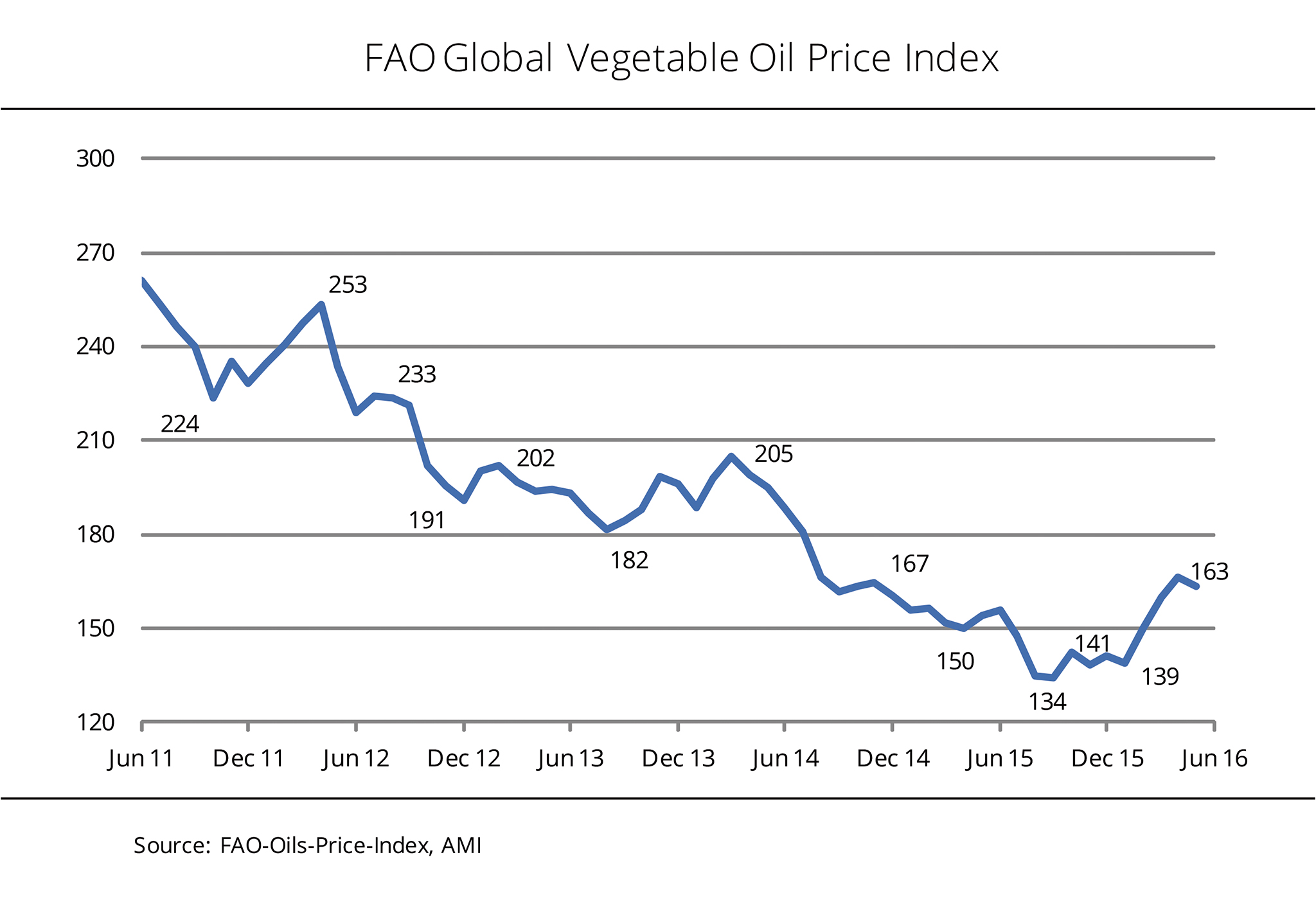 The vegetable oil price index of the Food and Agriculture Organization of the United Nations (FAO) dropped by 3 per cent in May 2016, interrupting the upward trend seen since January. Following a sharp rise by virtually one fifth since the beginning of the year, in May the upward trend was stopped for the time being. Prices for palm oil, the world's most important vegetable oil, saw a sharp drop in the wake of slack global demand combined with a surprisingly high output in the top palm oil producing countries. According to information published by Agrarmarkt Informations-Gesellschaft mbH (AMI), the index of 163 points was down 3 per cent from the previous month, but up 6 per cent on the previous year's level. The FAO price index measures the changes in international prices for ten different vegetable oils, weighted with their export shares in world trade. The Union for the Promotion of Oil and Protein Plants e.V. (UFOP) believes that raising the biodiesel blending requirements for biodiesel from palm oil is the only choice that is immediately effective on a large scale in the palm oil producing countries. The example of Malaysia illustrates this point. The country recently increased the blending quota to 10 per cent. Along with EU-based refineries producing hydrogenated vegetable oil (HVO), the chemical industry also benefits from this pressure on prices. UFOP points out that in Germany, the entire rapeseed crop has been certified as sustainable to meet legal requirements. According to UFOP, the leading palm oil exporting countries continue to be far from meeting this kind of standard. In fact, EU politicians should take this year's forest fires in Indonesia as a warning to further develop the sustainability requirements for biofuel feedstock specified in the European Renewable Energy Directive, instead of virtually abolishing them as the current funding period expires in 2020, UFOP suggests.