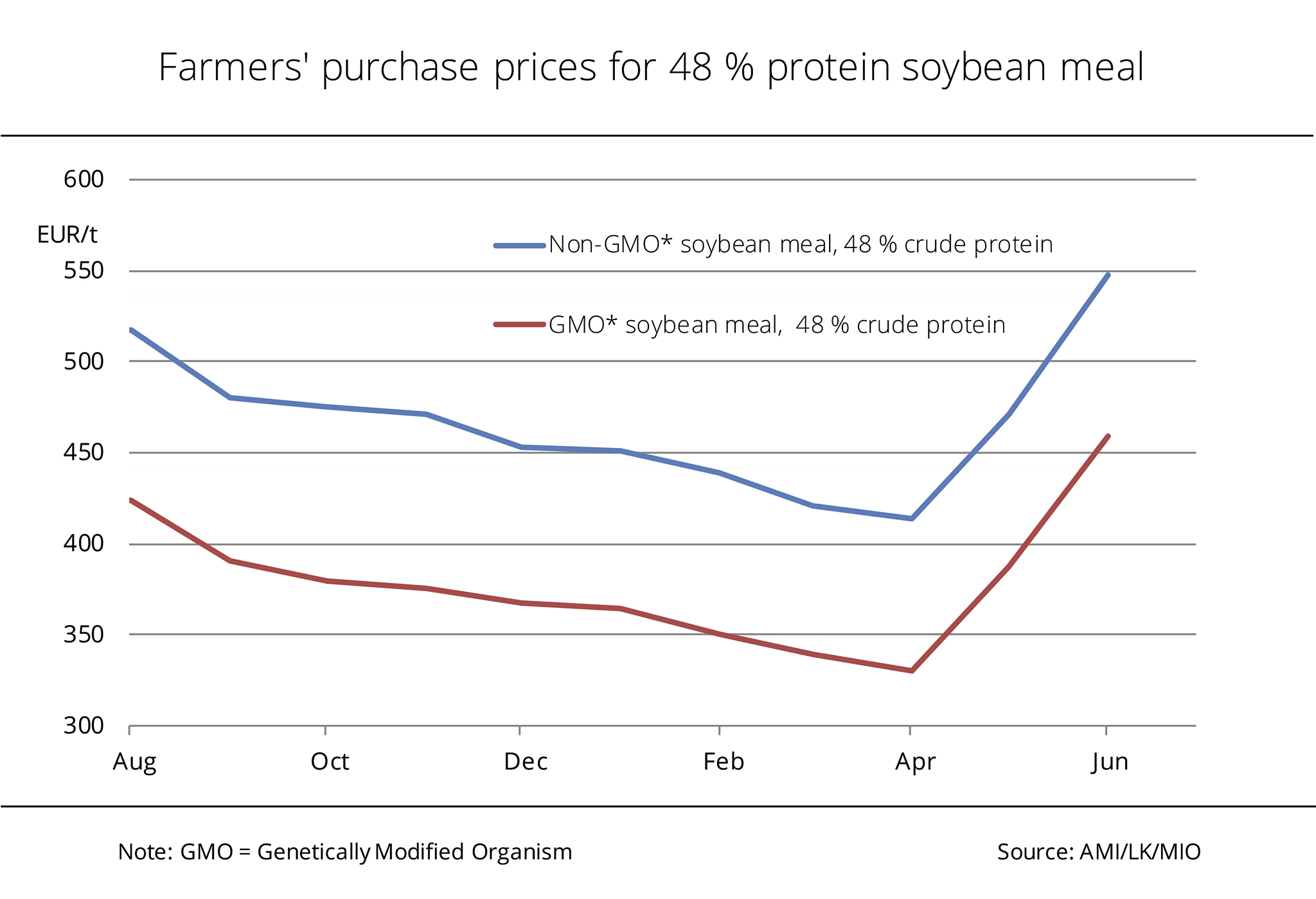 Spiking soybean prices have very recently also pulled up soybean meal prices in Germany. Wet conditions delaying harvest operations in Argentina and affecting soybean quality sent forward prices rocketing to a ten-month high. In April 2016, the previous downward slide of soybean meal prices ended abruptly. Prices delivered free to yard were up 14 per cent already in May 2016 and even saw a 17 per cent rise in June. At the same time, GMO and non-GMO soybean meal went up to virtually the same extent. The price spread between the two feed components recently amounted to EUR 89 per tonne. This is little more than the EUR 85 per tonne seen in the previous 2016 period. Consequently, the premium actually declined steadily compared to the previous years. In 2015, buyers had to pay on average EUR 99 per tonne more for GMO-free soybean meal and in 2013, it was in fact EUR 115 per tonne more. Until now, especially dairies in southern Germany have been known for focussing on milk produced without GMO feed or even without soybean meal. Now it is reported that some dairies from Schleswig-Holstein are planning to stop accepting the use of soybean meal feed as of October 2016.