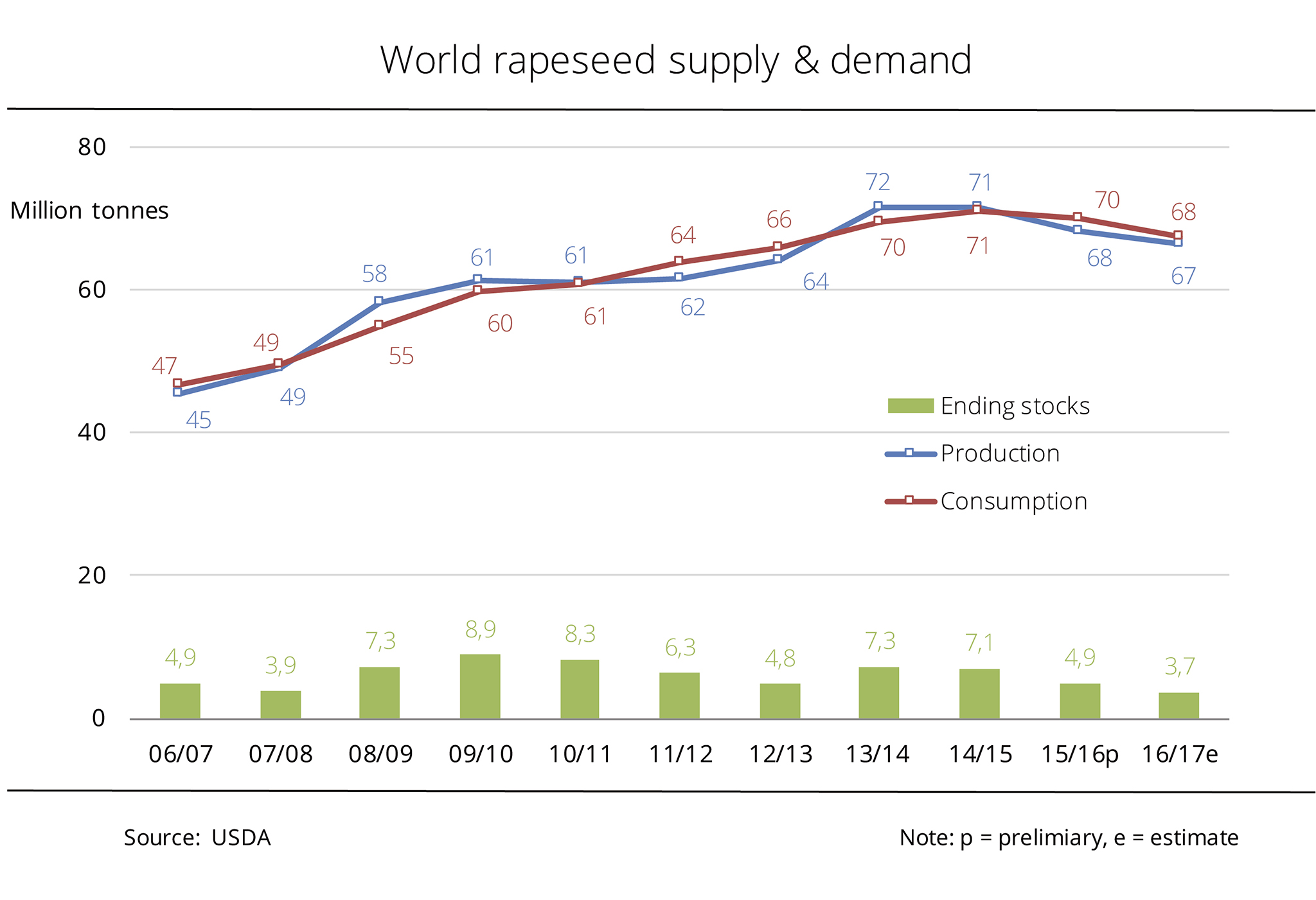Global demand for rapeseed is likely to exceed supply in 2016/17, as it did in 2015/16. Consequently, supplies could continue their slide, opening room for price increases in the long term. USDA currently estimates the 2016/17 global rapeseed production at 66.5 million tonnes, down just under 1.7 million tonnes from the previous year. Harvests in the top producing countries – Canada, China and the European Union – are expected to drop. China is projected to see the largest reduction in output, by around 7 per cent, to 13.3 million tonnes. At the same time, the USDA forecast puts the amount of rapeseed used in processing at 64.8 million tonnes. This figure is down from the previous year, but continues to be large. As at the end of the marketing year, global ending stocks could amount to around 3.7 million tonnes. This would translate to a 13-year low.
