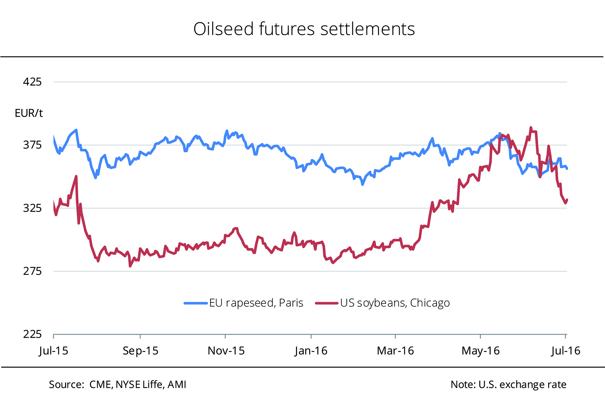 Positive crop prospects in the US put massive downward pressure on soybean prices. This has hardly had any impact on rapeseed in Paris to date. Neither are there any signs of decline in harvest. An anticipated drop in supply in the EU in 2016/17 and slow harvest progress sent prices on a slight upward trend. The nearby for soybeans in Chicago slumped below the level of USD 10 per bushel (the equivalent of EUR 334 per tonne) this week for the first time since April 2016. Fears of drought-related harvest losses in the US caused by the La Niña weather phenomenon are decreasing. In other words, the US crops have developed very well and provided the weather will be as favourable as has been forecast for the coming weeks yields could at least reach the previous year's level. According to Agrarmarkt Informations-Gesellschaft mbH (AMI), rapeseed prices in Paris cannot quite escape the pressure from overseas. However, prices are increasingly firming up. This trend is supported by a slow progress in the EU harvest and prospects for a general scarcity of supply in the EU in 2016/17.