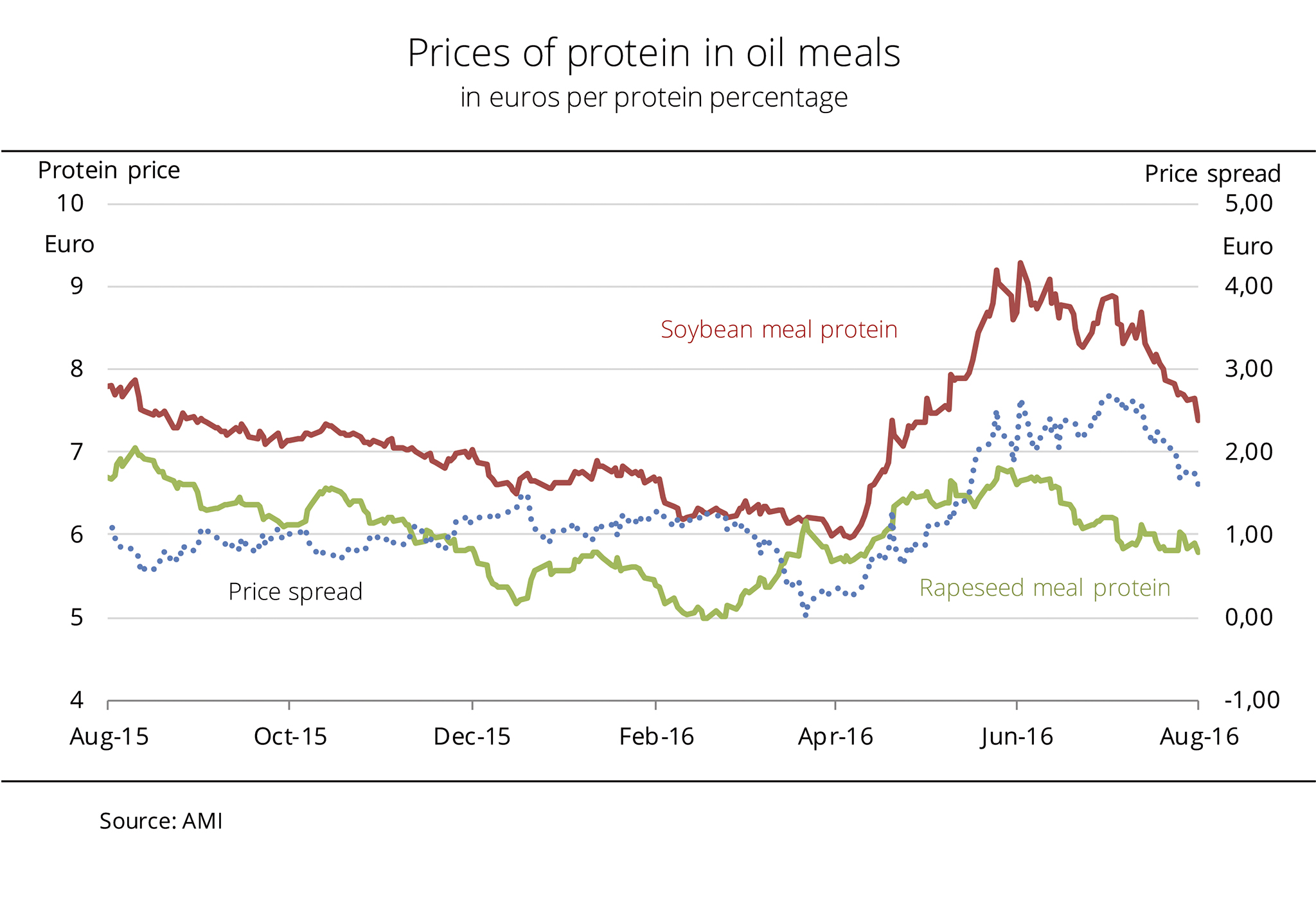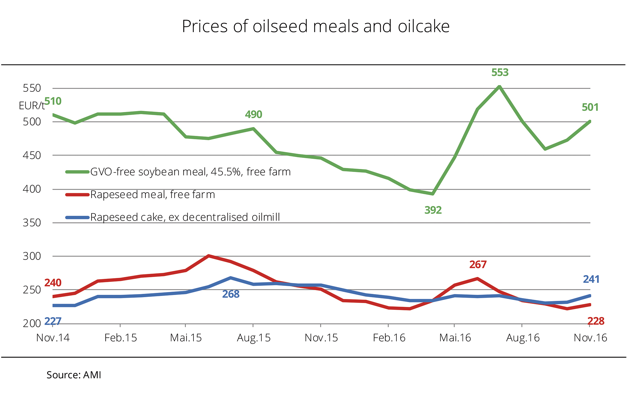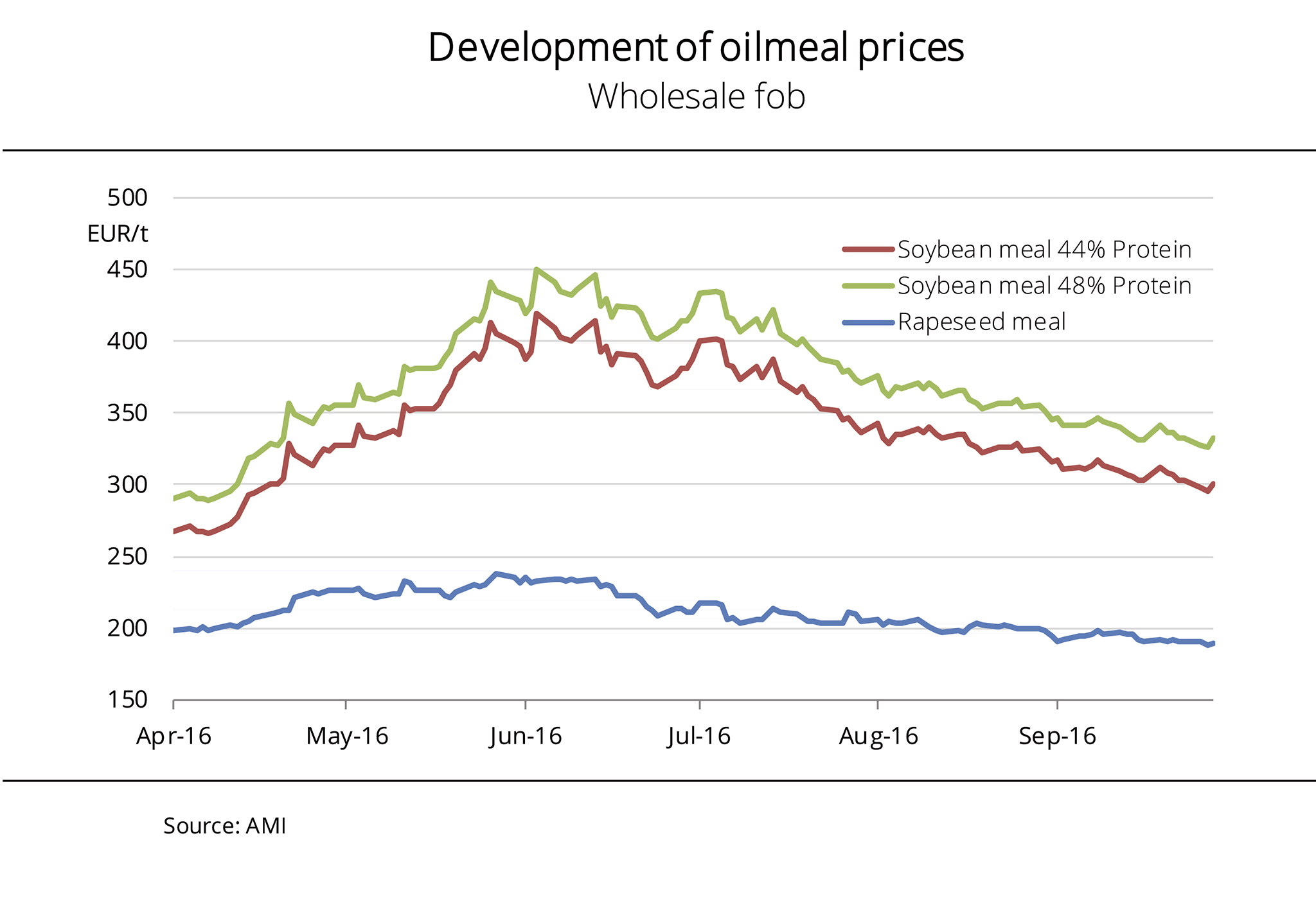 In Germany, prices for genetically modified (GMO) soybean meal have dropped significantly in light of a record world supply in 2016/17. At the end of September 2016, nearby supplies were at the lowest level since April 2016. Extensive global supplies and sluggish demand put pressure on asking prices in Germany. Buyers' interest in extracted rapeseed meal has nevertheless been growing, because extracted rapeseed meal is increasingly used in dairy farms as a domestic source of protein. The reason is that more and more dairies and, ultimately, retailers are demanding products labelled “GMO free” to meet consumer requirements. According to information published by Agrarmarkt Informations-Gesellschaft mbH, GMO-free soybean meal is also in strong demand, so that prices remain at their present level of EUR 100-110 per tonne above the price for GMO soybean meal. This price would be the actual reference price for extracted rapeseed meal, given that the meals are interchangeable.