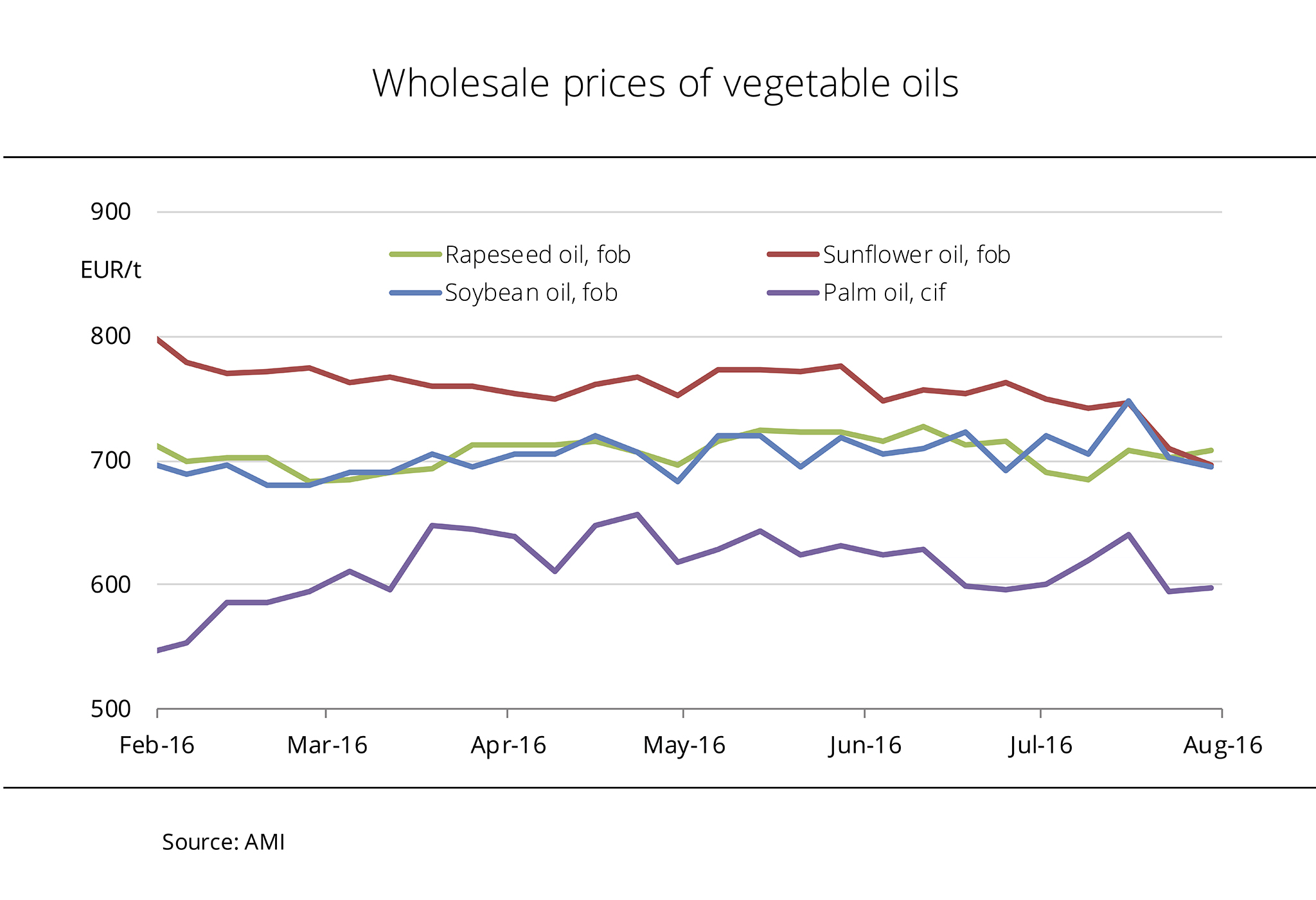 Vegetable oil prices on the European cash market converged. Only palm oil continued to lag far behind. The trend for the coming months is mixed. Prices for rapeseed oil, soybean oil and sunflower oil converged in July 2016. Whereas soybean oil and sunflower oil were on a sluggish trend due to abundant supply of feedstock, the price curves for rapeseed oil showed a slight upward trend. According to Agrarmarkt Informations-Gesellschaft mbH (AMI), oil mills are currently stocked up well with feedstock. However, supply could become increasingly difficult and more expensive in the coming months because of smaller than expected EU rapeseed supply. In addition, demand is picking up because the cap on greenhouse gas emission will rise from 3.5 to 4 per cent in 2017 and demand for biodiesel is going to surge as a result. This development is likely to stabilise the upward trend in prices of rapeseed oil. August volatility of soybean oil prices continues to be large due to the US weather market. The downward pressure on palm oil is expected to grow continuously in view of a record production in Southeast Asia in 2016/17.