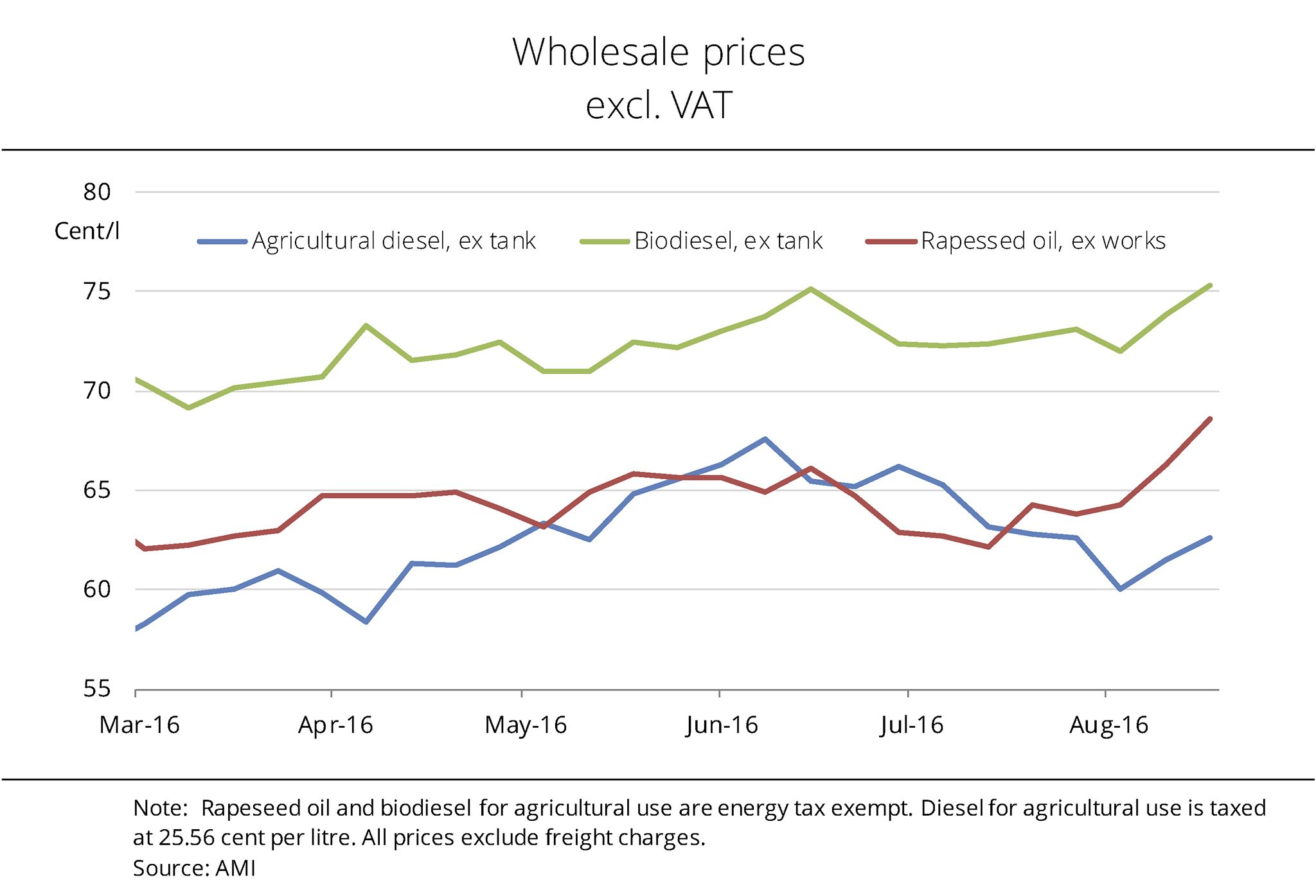 Wholesale prices for agricultural diesel, biodiesel and rapeseed oil have gone up considerably in August. Rapeseed oil fuel and biodiesel hit record levels. Agricultural diesel continued to be the lowest-priced alternative despite the price rise. Prices for agricultural diesel and biodiesel were raised massively in mid August 2016 as manufacturers' feedstock costs surged. In other words, WTI crude oil prices shot up by around 9 per cent within a single week. Prices of vegetable oils used in biodiesel fuel production also rallied in the wake of poor yields. Rapeseed oil for nearby delivery most recently cost just less than 69 euro cents per litre, a price not seen since mid December 2015. As a result, the selling price for standard biodiesel with an around 60 per cent potential for reducing greenhouse gas emission compared to fossil fuels rose to 75 euro cents per litre. According to Agrarmarkt Informations-Gesellschaft mbH (AMI), this price not only translates to an eight-month high, but has also increased the gap over agricultural diesel to almost 13 euro cents per litre.