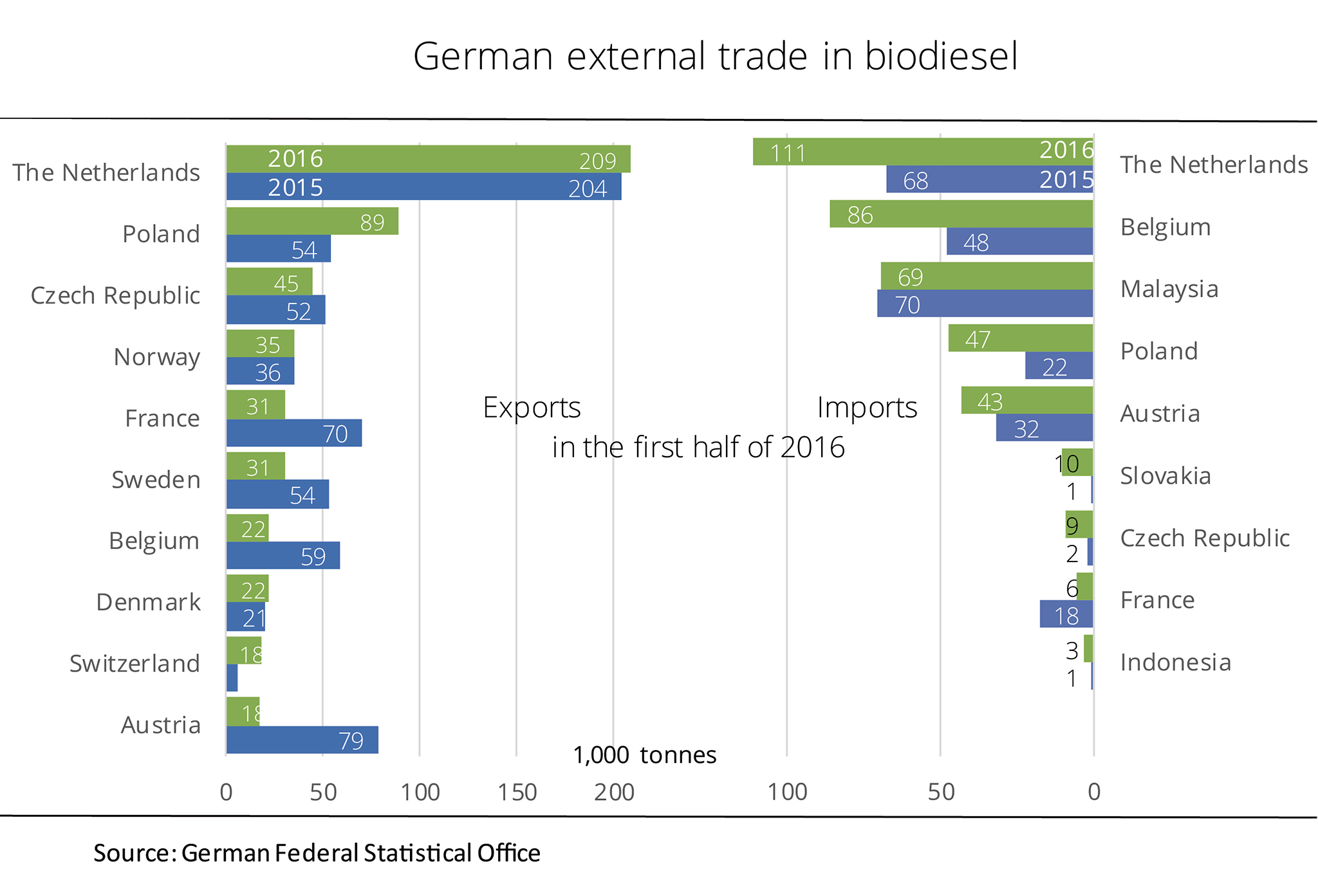 Demand for German biodiesel waned significantly in the first half of 2016. At just over 570,000 tonnes, exports to other European countries was down just about one fifth from the 2015 reference period. Above all, countries that absorbed only small amounts the previous year bought even less in 2016. By contrast, sales to the main destinations, such as the Netherlands and Poland, increased. At the same time, Germany imported more biodiesel from abroad. At 390,000 tonnes, the rise amounted to 46 per cent. More imports came via the European import ports in the Netherlands and Belgium, as well as from Poland and Austria. By contrast, direct shipments from Southeast Asia saw a slight dip. Agrarmarkt Informations-Gesellschaft mbH (AMI) indicated that the foreign trade statistics consequently reflect that nevertheless biodiesel exports continue to play an important role in the utilization of German biodiesel plants. There is currently no way of knowing whether this trend is going to continue in the second half year. The growing use of biodiesel from Used Cooking Oil Methyl Ester (UCOME) may be one factor explaining the current slump in foreign demand. UCOME may be counted double towards renewable quota obligations in countries like the Netherlands, Poland and Great Britain.