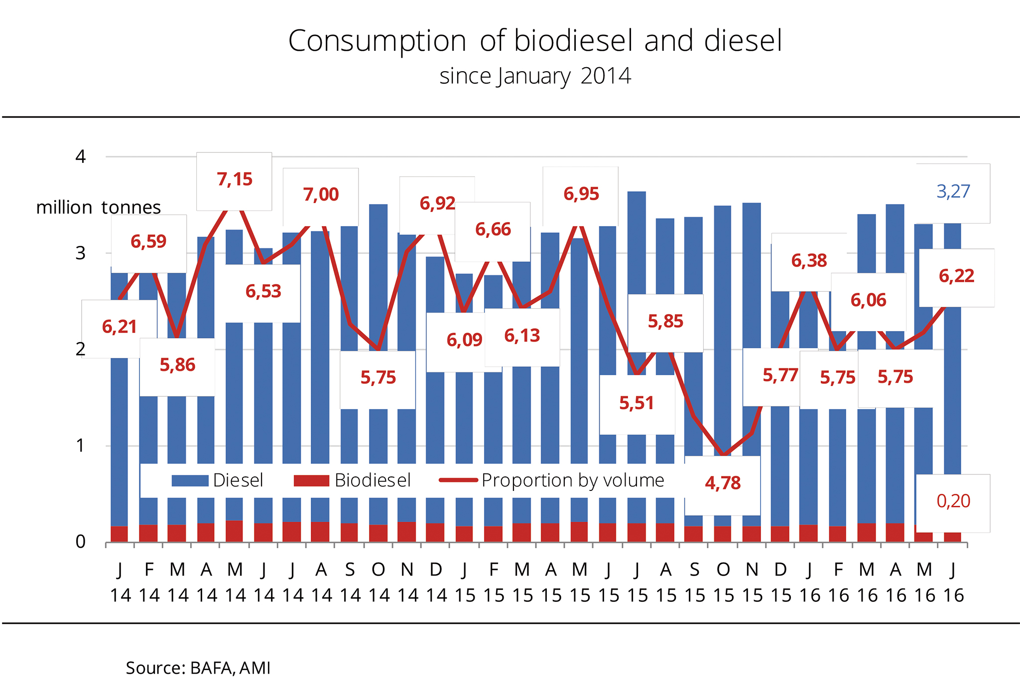 The comparatively low purchase prices for biodiesel have stimulated demand appreciably. The June 2016 volume of biodiesel in blends surged to 6.22 per cent, the highest level since the beginning of the year. Total June 2016 consumption of diesel fuel shot up by just less than 5 per cent, to 3.3 million tonnes, from the previous month. Consequently, the volume amounted to around 18.6 million tonnes in the first half year. This translates to a 7 per cent rise year-on-year. The trend also drove up consumption of biodiesel - to a much lower degree - by one per cent, to 1.1 million tonnes. In other words, the volume of biodiesel in blends remained below the level of 6 per cent most of the time. Consumption figures did not rise substantially until June 2016. The Federal Office for Economic Affairs and Export Control (BAFA) reported that demand for biodiesel for blending amounted to 203,223 tonnes that month. The was the largest quantity in more than one year. If demand for mineral diesel continues to rise, it could also support sales of biodiesel. However, this outlook is dampened by the fact that over the past few weeks biodiesel prices have continuously increased compared to diesel, according to Agrarmarkt Informations-Gesellschaft mbH (AMI).