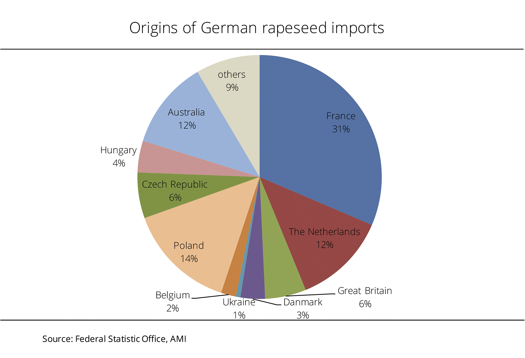 The German Federal Statistical Office reports significant increases in rapeseed imports in 2015/16, which reached a record peak at 5.4 million tonnes. In the 2015/16 marketing year, the oil mill industry imported 5.4 million tonnes of rapeseed. This was up just over 14 per cent from a year earlier and the highest quantity ever. Traditionally, the largest quantity came from the EU-28, although their share decreased considerably to 86 per cent. The main EU supplier, France, supplied 1.7 million tonnes, approximately 12 percent more than the previous year. In addition, German imports of non-EU rapeseed via the Netherlands rose to just under 672,500 tonnes. According to information published by Agrarmarkt Informations-Gesellschaft mbH, this quantity translates to a record high and double the 2014/15 figure. The largest third-country supplier, Australia, was overall third most important supplier despite substantial growth in exports to an all-time high of 636,000 tonnes.