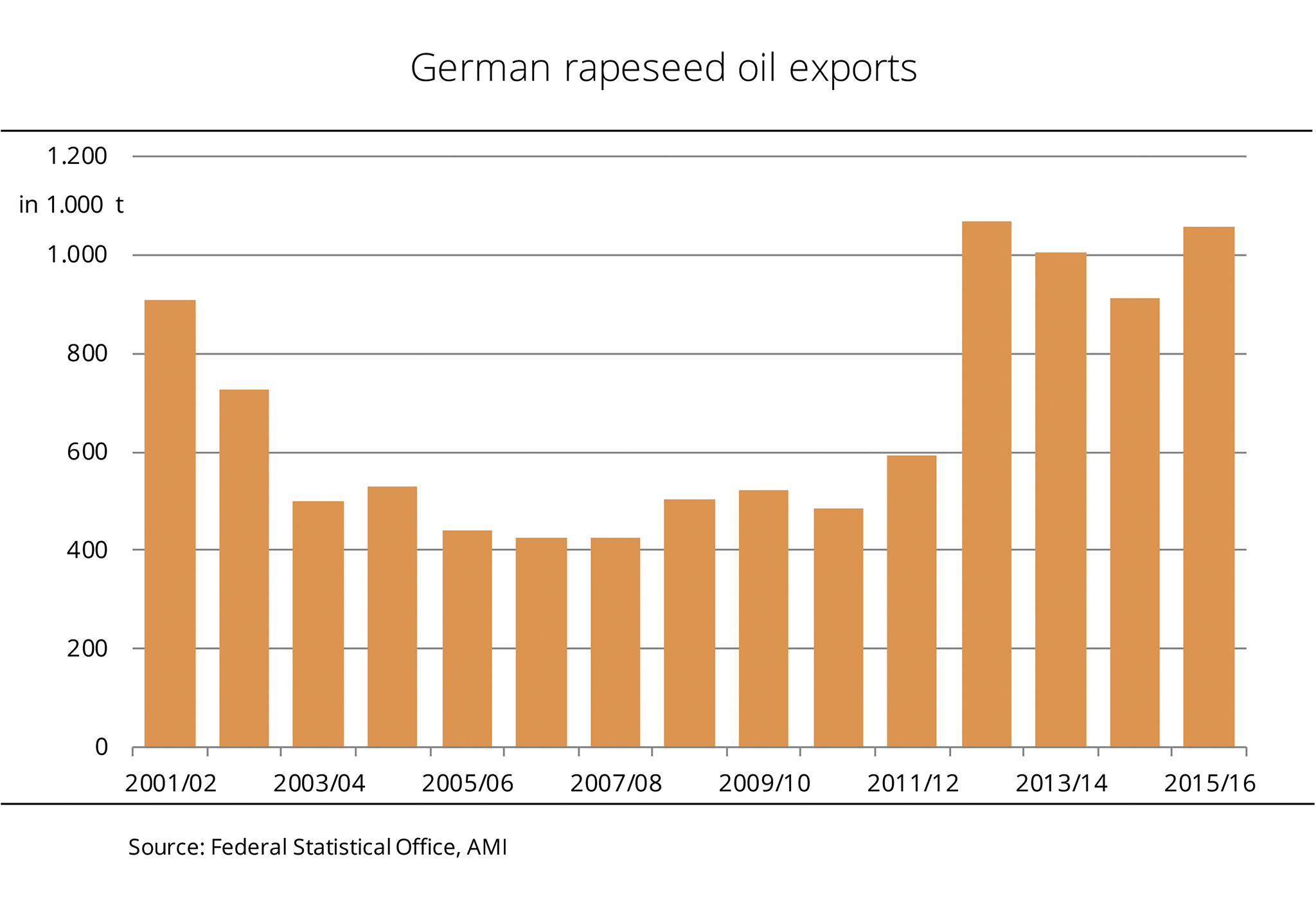 German exports of rapeseed oil hit a three-year high in the 2015/16 marketing year. Order volumes from some EU member states and third countries grew substantially. German 2015/16 exports of rapeseed oil climbed significantly, according to figures published by the German Federal Statistical Office. At around 1.1 million tonnes, they were up almost 16 per cent from 2014/15. Around 91 per cent went to other EU countries, which was 3 per cent less than the previous period. The Netherlands, the hub of international trade, were again the main buyer, accounting for 484,000 tonnes (up 7 per cent). The Netherlands were followed by Poland, where imports were up by 53 per cent to 157,000 tonnes. Belgium occupied third place, despite a massive decline in imports to 87,000 tonnes. The EFTA states (Iceland, Norway, Switzerland), on the other hand, purchased a record volume of 78,000 tonnes, Agrarmarkt Informations-Gesellschaft mbH reports.