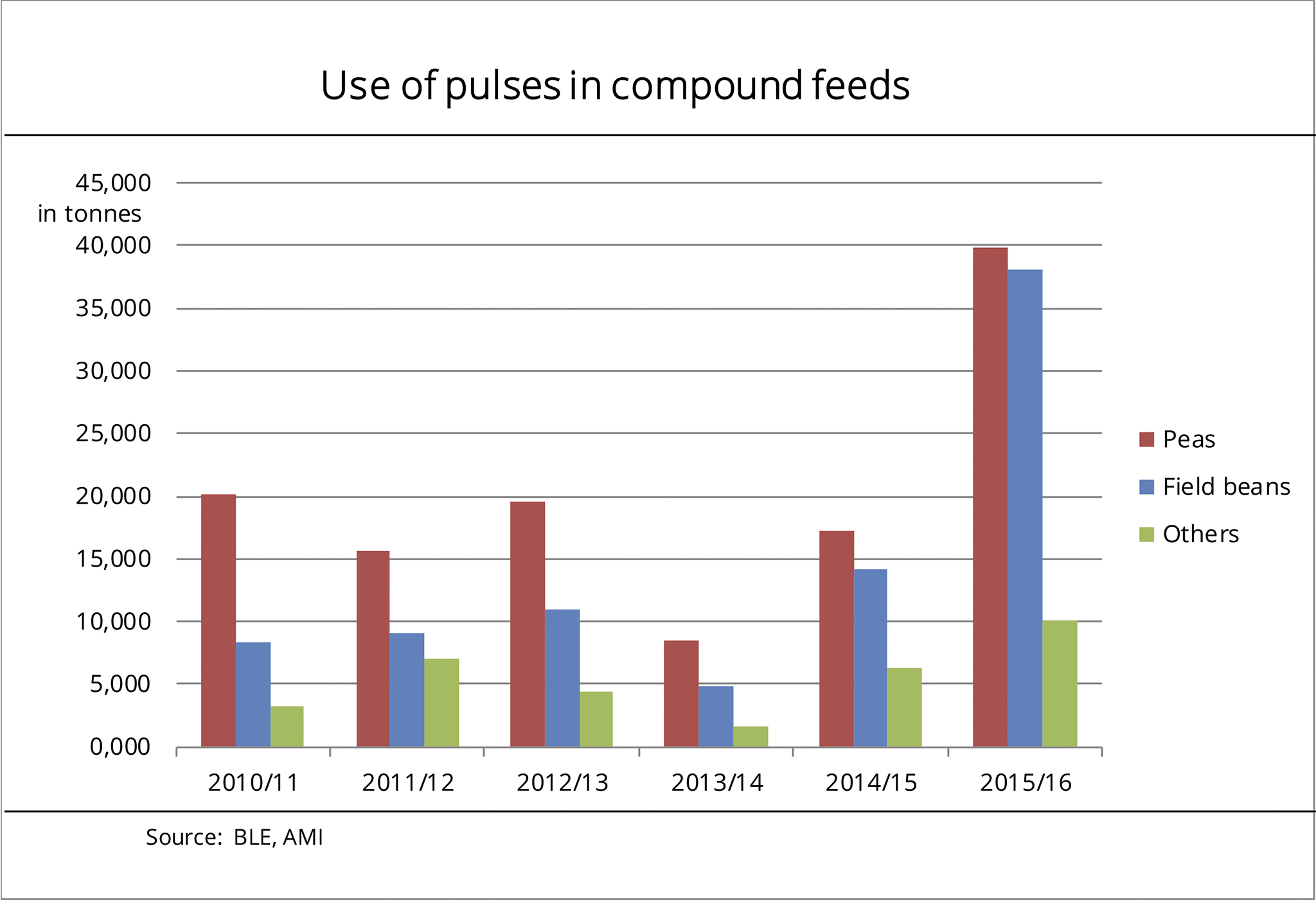 The changes in agricultural aid have given a boost to the production of legumes. Pulses are mainly used in farm-made feeds as a major source of protein. However, the mixed feed industry has discovered home-grown pulses too. In view of the Greening requirements, German farmers planted around 160,400 hectares with legumes in 2015. The harvest of peas, field beans and sweet lupines amounted to around 450,000 tonnes. This was a level of quantity that also aroused the interest of the German mixed feed industry, which, according to the Federal Office for Agriculture and Food (BLE), used around 88,000 tonnes of pulses in compound feeds in 2015/16. Although this figure is small compared to that of cereals, it provides a clear signal after several years of decline. After all, the quantity processed was more than twice the previous year's volume. No other feed component has seen such growth rates. However, the chances are that this trend could soon end as the EU Commission plans to introduce more stringent requirements for receiving the Greening payment, Agrarmarkt Informations-Gesellschaft mbH reports. The tightening of conditions would include a ban on applying crop protection products in legume production, although control of pests and diseases is essential to maintaining crop yields and quality. As a result, growing pulses would become unattractive to farmers. Pulses would sink back into their tiny niche, delivering a heavy blow to the German government's protein plant strategy.