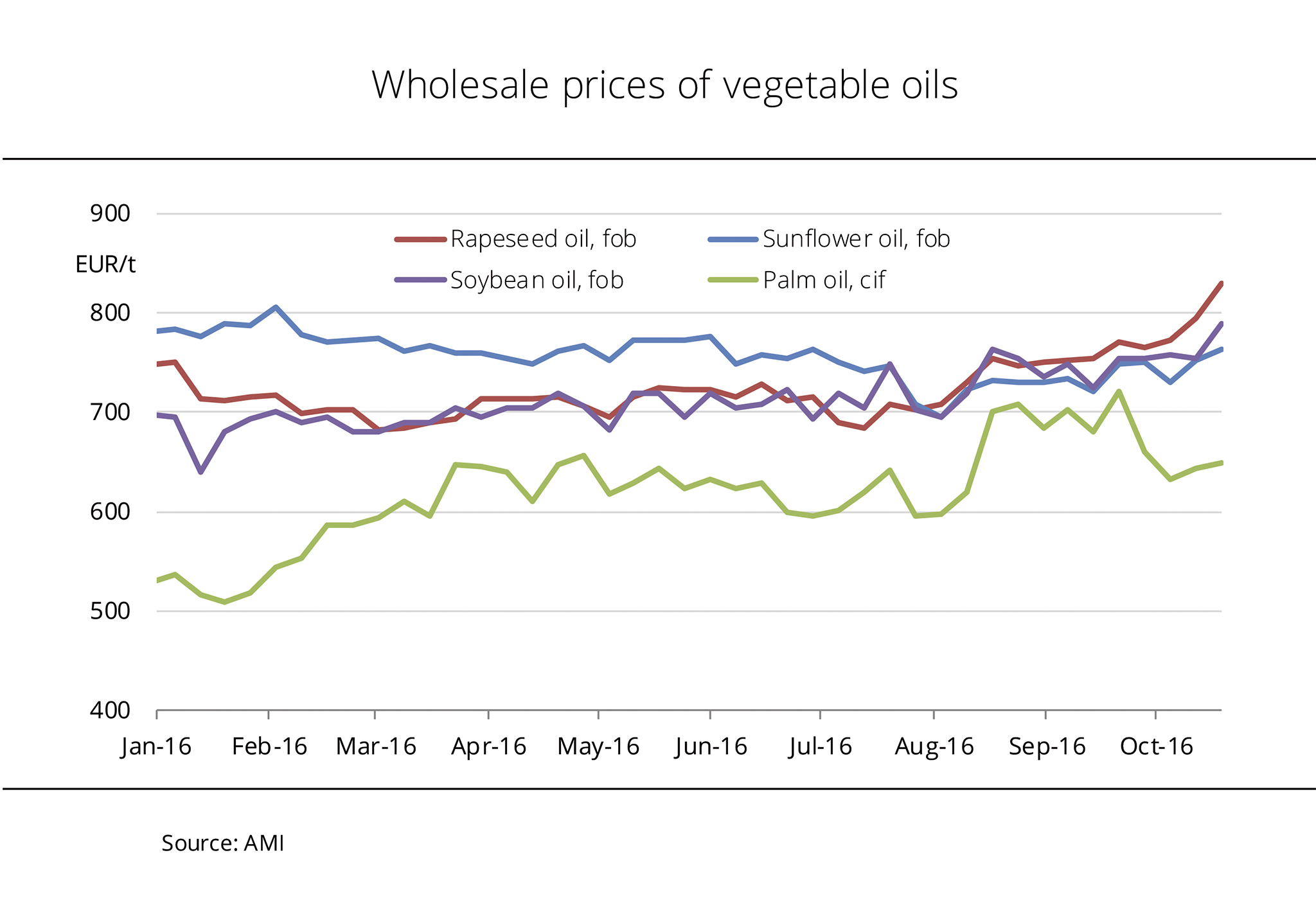 Spot prices for vegetable oils were raised significantly in the wake of the rally for palm and soybean oil. Having risen to a three-year high at EUR 830 per tonne, rapeseed oil is more expensive than sunflower oil. Prices for rapeseed oil picked up especially sharply as their surge was additionally driven by rising feedstock costs and the weak euro (which encourages exports). Feedstock prices are also supported by the fact that conditions for harvesting rapeseed have been less than optimal following snowfalls in Canada. Moreover, the European biodiesel industry has an increased demand for rapeseed oil because it has to comply with the quality requirements for winter diesel as laid down by the biodiesel standard. On the European vegetable oil market in Rotterdam, rapeseed oil is more expensive than sunflower oil, reflecting the contrary supply situation clearly. In the Netherlands, even premiums are currently paid on contracts for rapeseed. In Germany, the situation is exacerbated by the low water levels on inland waterways. On the one hand, feedstock cannot be delivered, and, on the other, vegetable oil cannot be called forward. Agrarmarkt Informations-Gesellschaft mbH reports that the rally on the futures market was triggered by the reduced supply outlook for palm oil and the small supplies of soybean oil in the US.