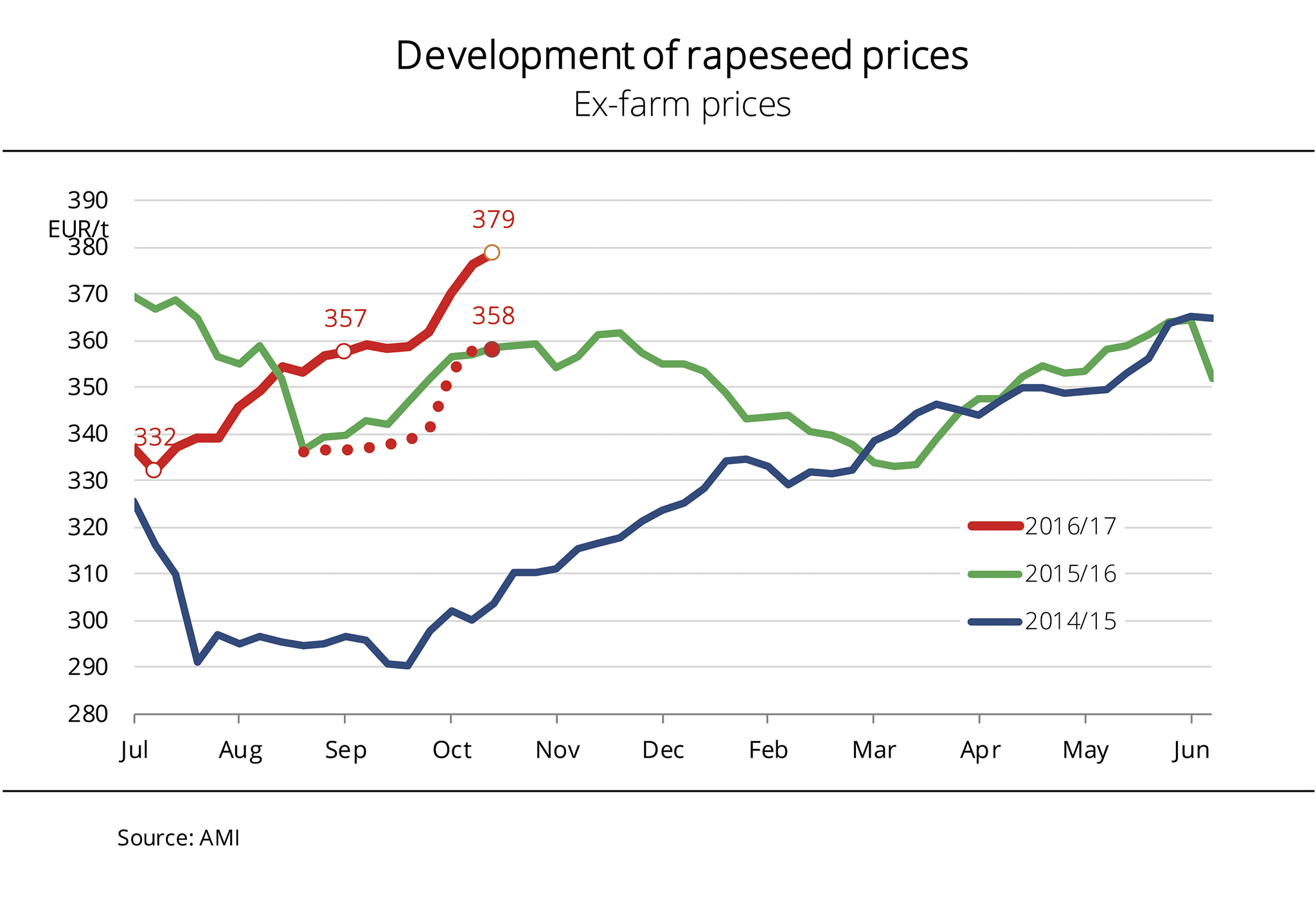 Most recently, the average price farmers received for rapeseed was at just under EUR 380 per tonne free storage facility, a level not seen since May 2014. The factors that contributed to supporting the rapeseed price originated, first and foremost, from overseas. German rapeseed prices have climbed continuously since the 2016 harvest began. However, the price surge has been especially sharp over the past two weeks, Agrarmarkt Informations-Gesellschaft mbH reports. Rapeseed prices were, first and foremost, supported from overseas. On the one hand, prices for soybeans went up significantly due to brisk demand from China, surpassing the psychological barrier of USD 10 per bushel (EUR 340 per tonne). On the other hand, the rapeseed harvest in Canada is severely hampered by snow and rainfall. At the ICE in Winnipeg, quotes soared by ten per cent in only three weeks. Vegetable oil prices also rose strongly in response to brisk demand for, and tight availability of, palm oil. At the same time, crude oil trended higher, whereas the weak euro increased EU export prospects. In other words, forward prices of rapeseed in Paris climbed above the EUR 400 per tonne mark to an 18-month high and pushed up producer prices in Germany.
