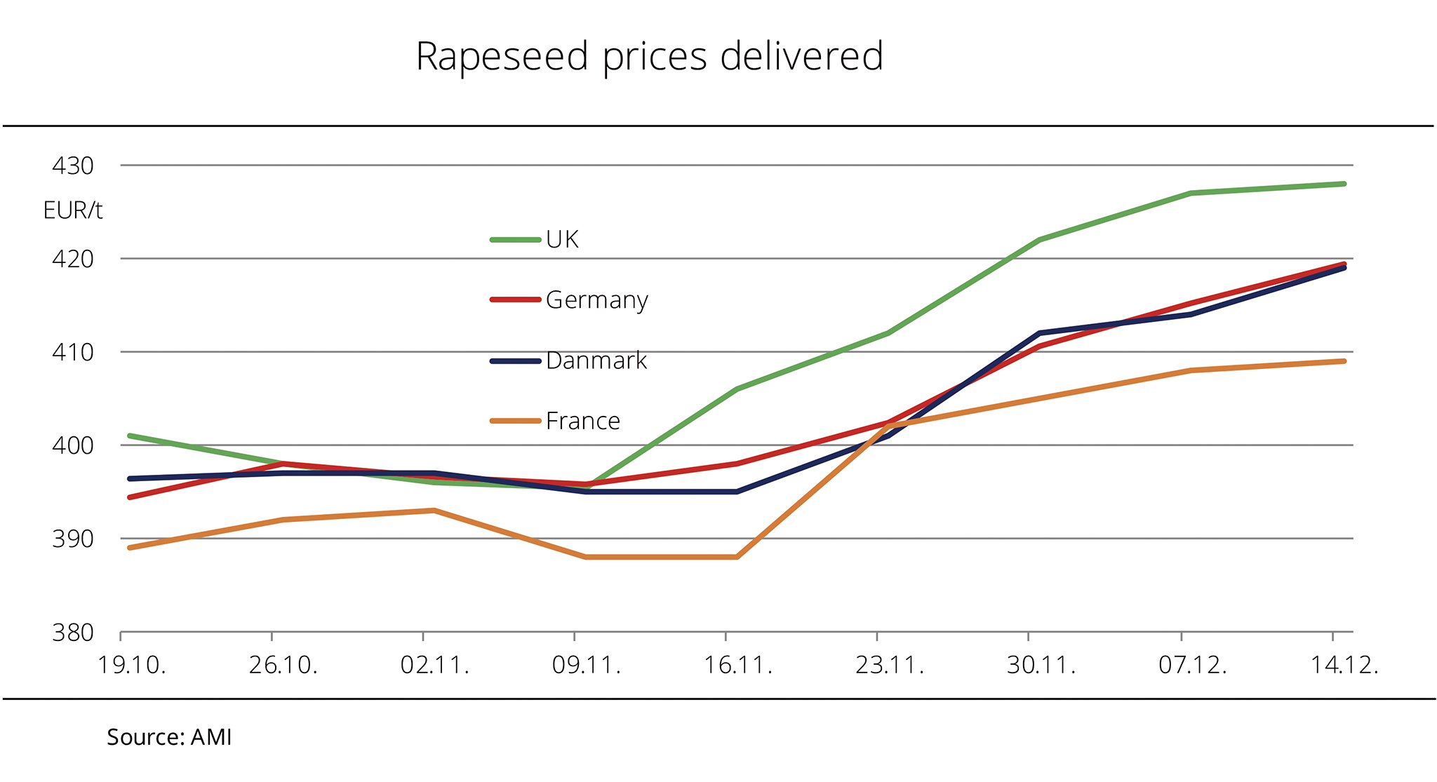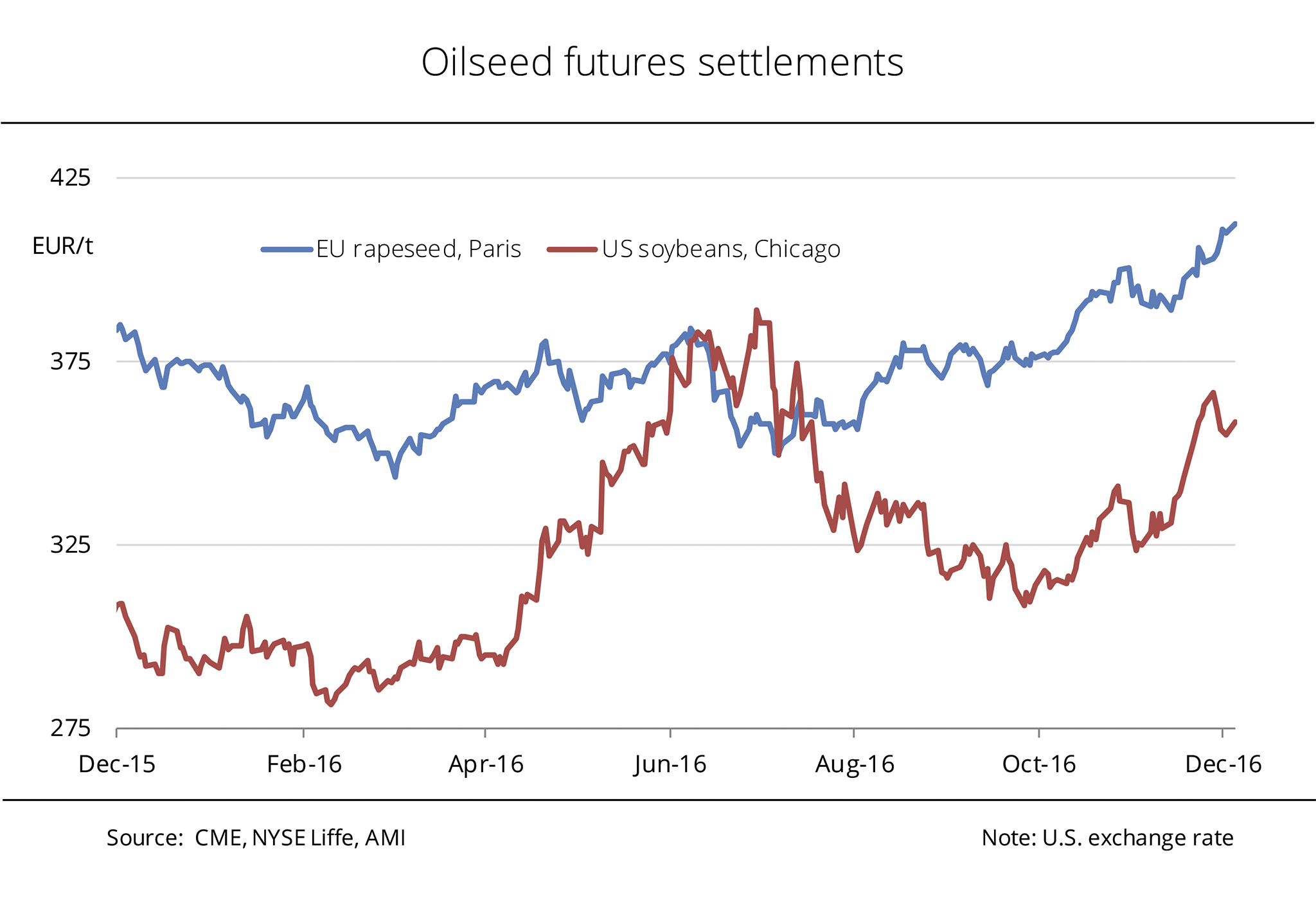 Firm prices for soybeans, palm oil and crude oil have sent prices for rapeseed on a sharp climb over the past few days. At the futures exchange in Paris on 6 December 2016, the nearby closed at EUR 412.50 per tonne, the highest level since April 2014. Consequently, rapeseed increased in value by 6 per cent in only three weeks. In the same period, US soybeans even rose by 7.5 per cent. Above all, soybeans benefited from an unexpected buying interest by China. Also, the falling dollar improved the prospect of future business. At the same time, the incipient weather markets in South America made an impact. More specifically, as Argentine growing conditions for freshly sown beans seemed to be too dry, renowned analysts already reduced their harvest estimates. In other words, the chances are that the crop could be even smaller than the previous year. This situation has lent support to prices and shifted the focus to the development in South America. However, as conditions in Brazil have been fine, the crop forecast remains at an estimated record high of 102 million tonnes. German rapeseed prices also benefited from the firm prices for palm oil in Malaysia. The foreseeable scarcity of supply has already supported prices over the past few weeks. Given a weak domestic currency that encourages exports, the gap between supply and demand could narrow further, especially because this month's palm oil output is estimated lower than the previous month's volume. Palm oil prices went up 13 per cent over the above-mentioned three-week period. Due to tight domestic supply, rapeseed prices in Paris did not completely reflect wholesale prices in Germany. In some cases, oil mill owners accepted a premium of EUR 13 per tonne for nearby supplies, according to information published by Agrarmarkt Informations-Gesellschaft mbH. The supply situation in Great Britain was tighter still, with premiums amounting to as much as EUR 15 per tonne. By contrast, the small French rapeseed crop failed to secure a bonus as bids from oil mills remained below the forward rate.