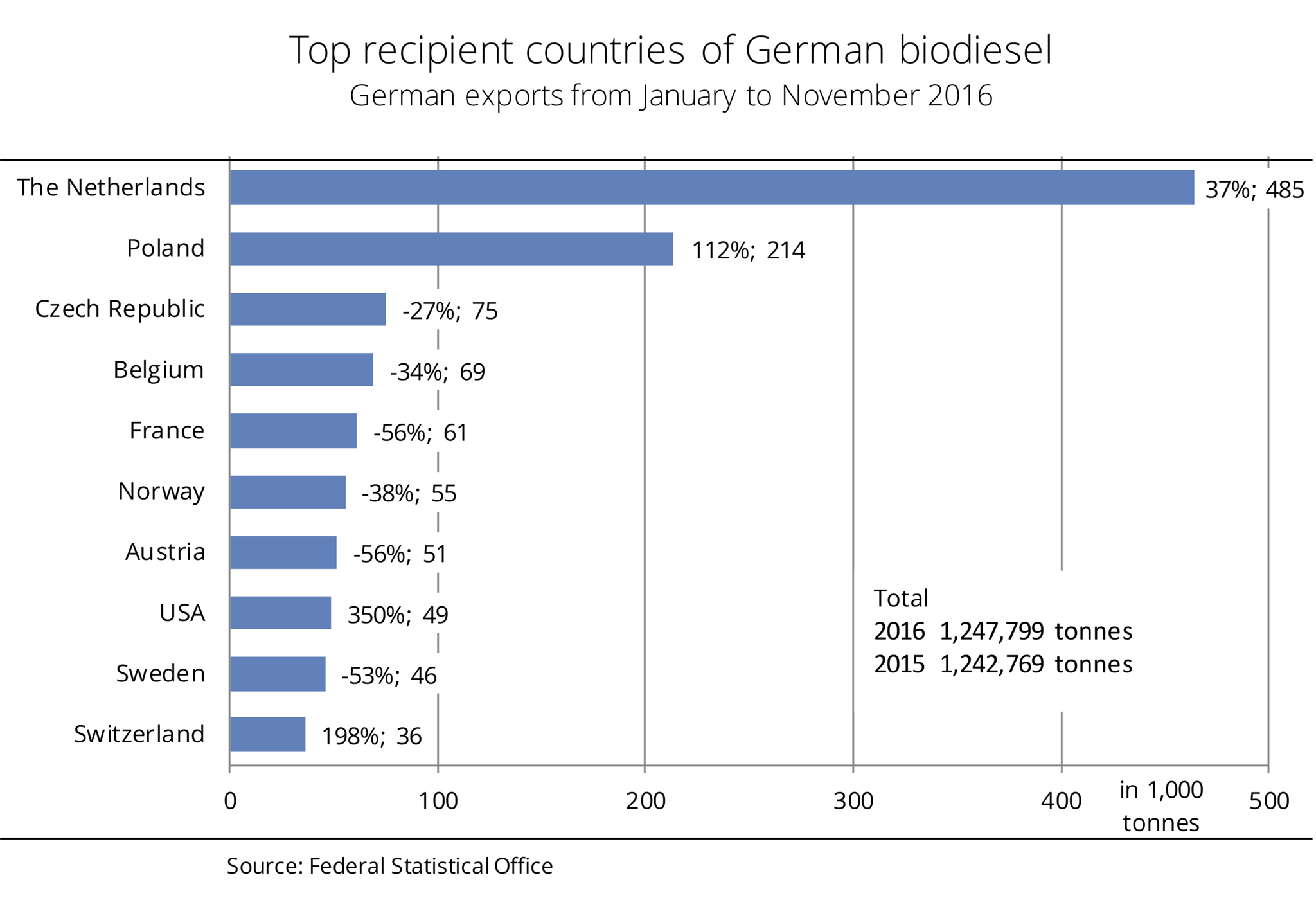 German biodiesel exports over the first ten months of 2016 slightly exceeded those of the same period in 2015. The significant drop in demand for biodiesel from the majority of European trading partners was offset by an increase in shipments to the Netherlands and Poland. German biodiesel exports reached 1.25 million tonnes by the end of October 2016, exceeding the previous year's figure by 0.4 per cent. This means that the previous downward trend no longer continues. According to Agrarmarkt Informations-Gesellschaft mbH, the Netherlands continue to be the primary recipient country. The export volume went up by 37 per cent from the previous year, to around 485,000 tonnes. Surprisingly, Polish trading partners purchased more than twice the biodiesel amount of the previous year. This moved Poland up to the second position among the main importing countries. By contrast, countries such as the Czech Republic, France or Austria reduced their imports by between 27 per cent and 56 per cent. Biodiesel exports to Switzerland and the US saw the biggest increases, with Switzerland raising its purchases by virtually 200 per cent and the US increasing imports by 350 per cent. However, at 36,000 tonnes and 49,000 tonnes respectively, the volumes were comparatively small.