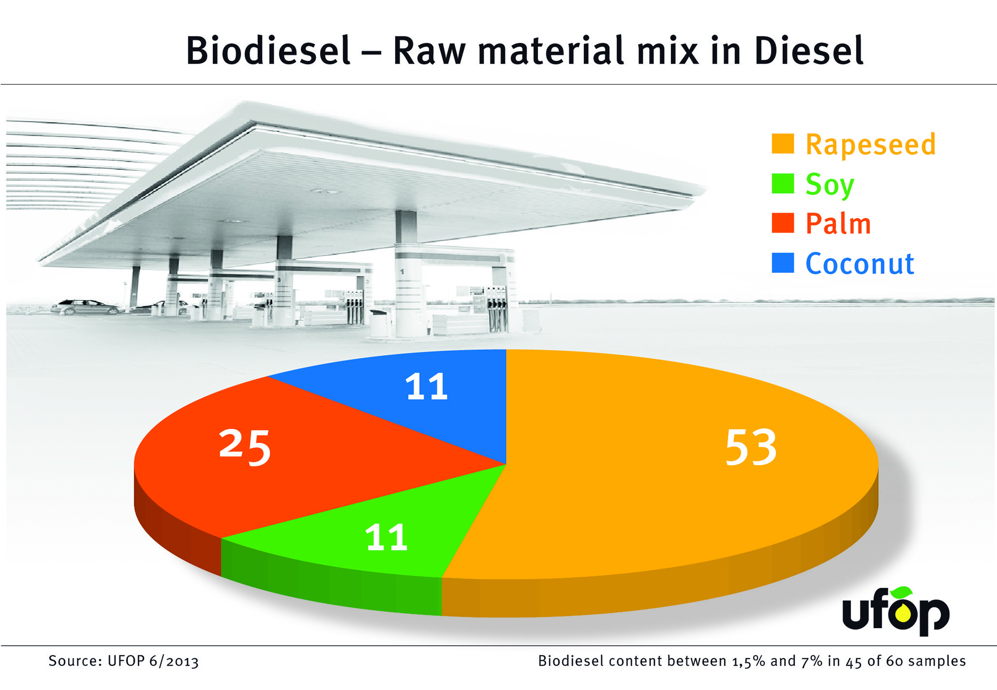 Berlin, 12.07.2013 – With 53 percent raw material content, rapeseed oil remains the most important raw material source for the production of biodiesel in Germany, followed by palm oil with 25 percent, coconut and soya oil with 11 percent respectively. This is the result of the study presented by the Union zur Förderung von Oel- und Proteinpflanzen e.V. (UFOP). 60 filling stations of mineral oil companies throughout Germany – weighted according to market shares – were sampled and the biodiesel component in the diesel fuel as well as its raw material composition were determined on behalf of the UFOP.