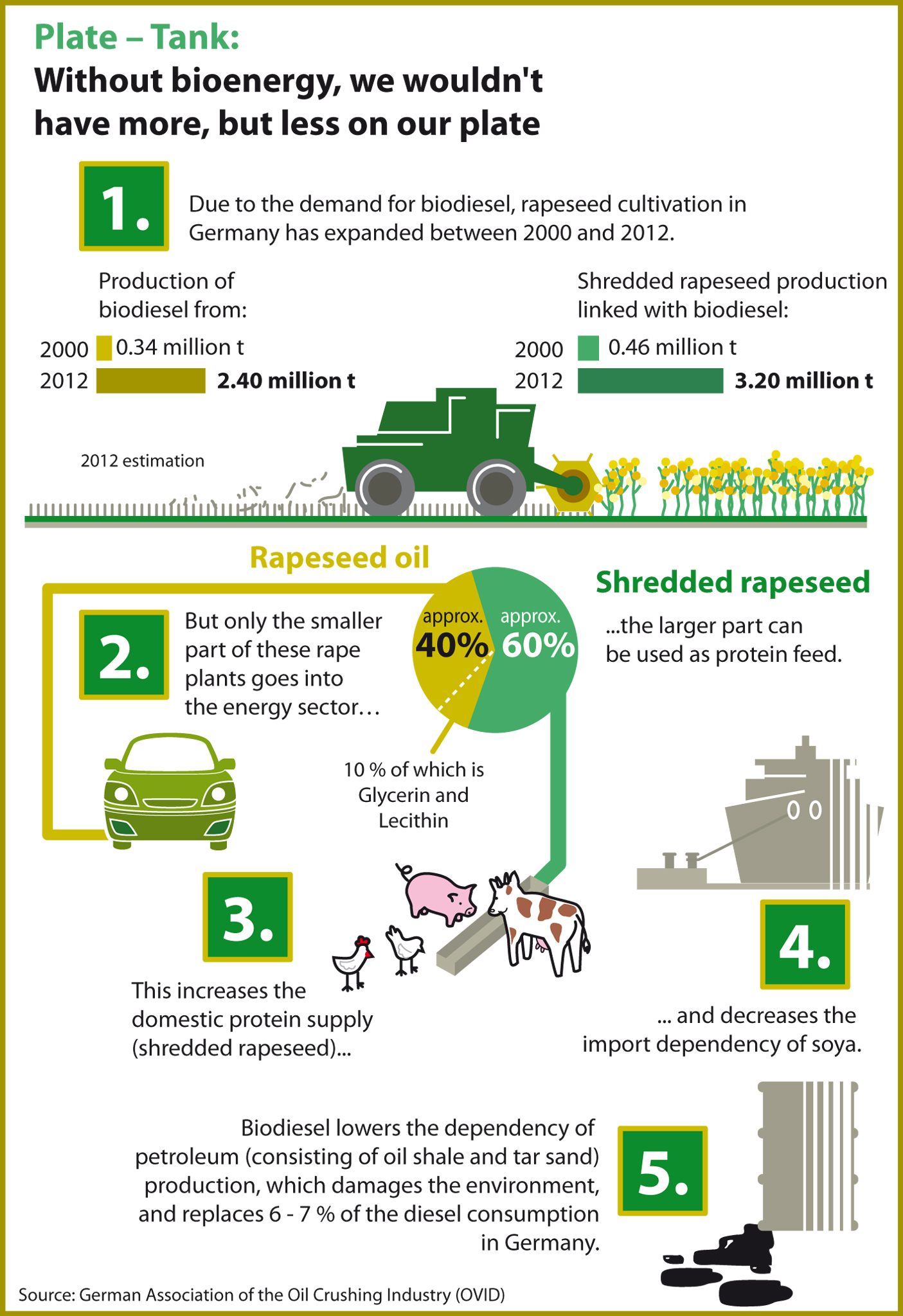 There is one central argument in the debate on bioenergy vs. world food which many people are not aware of: Only a small part of the rape plant is actually used for the energy sector in the production of biodiesel: vegetable oil (approx. 40 %). The larger part constitutes the oil meal extracted (approx. 60 %), which is used as feed containing protein in animal nutrition for the production of milk, cheese, eggs and meat, and is therefore also available to the food market. Biodiesel is therefore not competing against safeguarding global nutrition, rather it has brought more amounts of feed into the food chain in Germany by expanding the cultivation areas for rapeseed due to the demand for biodiesel. As a consequence, this means: Without biodiesel production, we would have less on our plates, not more!
