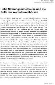 Warentermingeschäfte mit Agrarrohstoffen stehen seit einigen Monaten im Mittelpunkt einer intensiv geführten politischen Diskussion. Besonders die institutionellen Anleger werden als Gefahr angesehen, weil sie mit hohem Kapitaleinsatz den Markt vor sich hertreiben und damit Nahrungsmittel verteuern und den Hunger der Welt fördern. Die EU-Kommission arbeitet daher aktuell an Regulierungsvorschlägen, mit denen eine größere Markttransparenz geschaffen sowie strengere Kontrollen umgesetzt werden sollen. So hält es EU-Agrarkommissar Dacian Ciolos auch für sinnvoll, die Anlagemengen an Warenterminbörsen zu beschränken. Solchen Forderungen nach einem Eingriff in den Terminhandel liegt die Annahme zu Grunde, dass die Börsenpreise die Angebots- und Nachfrageverhältnisse des Marktes nicht mehr widerspiegeln. Nach Ansicht von Dr. Reimer Mohr von der Hanse Agro Unternehmensberatung, der im Auftrag der Union zur Förderung von Oel- und Proteinpflanzen e. V. (UFOP) die Rolle der Warenterminbörsen analysiert hat, sind Forderungen nach einer Beschränkung von Warentermingeschäften nicht vertretbar.