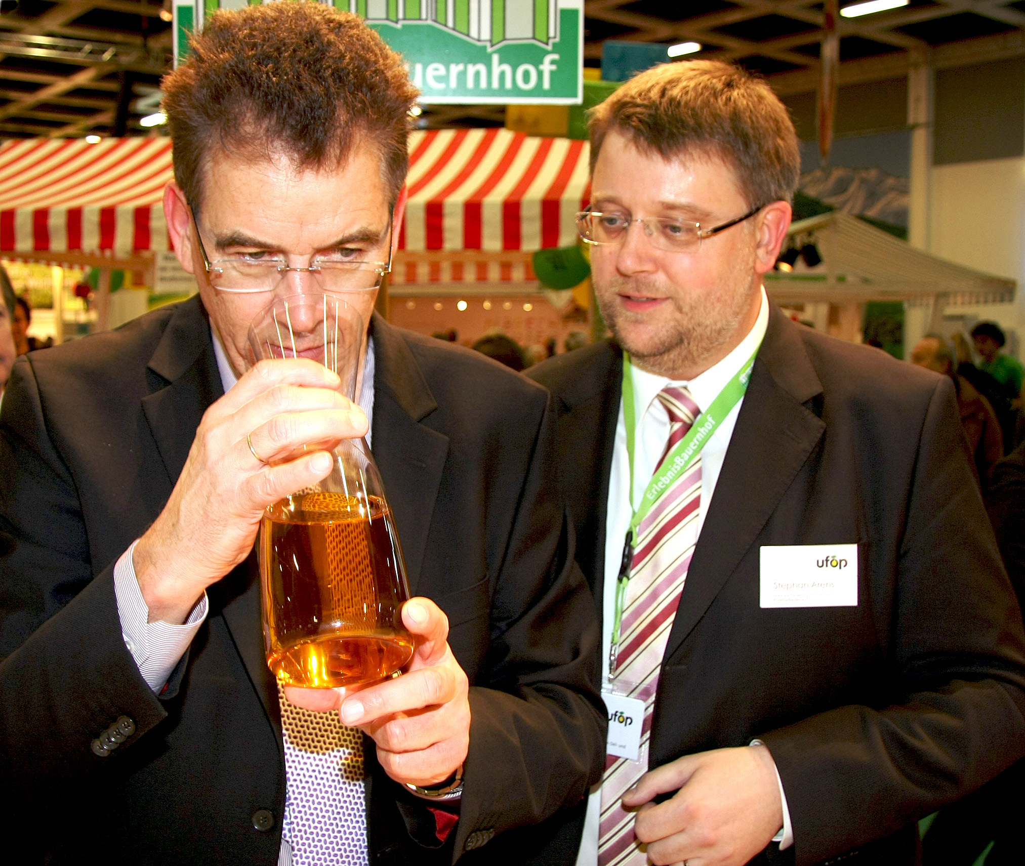 Der Parlamentarische Staatssekretär im BMELV, Dr. Gerd Müller, zusammen mit Stephan Arens, dem Geschäftsführer der Union zur Förderung von Oel- und Proteinpflanzen e. V. (UFOP) beim Rapsöl-Test auf dem UFOP-Messestand im Rahmen der Internationalen Grünen Woche 2012.