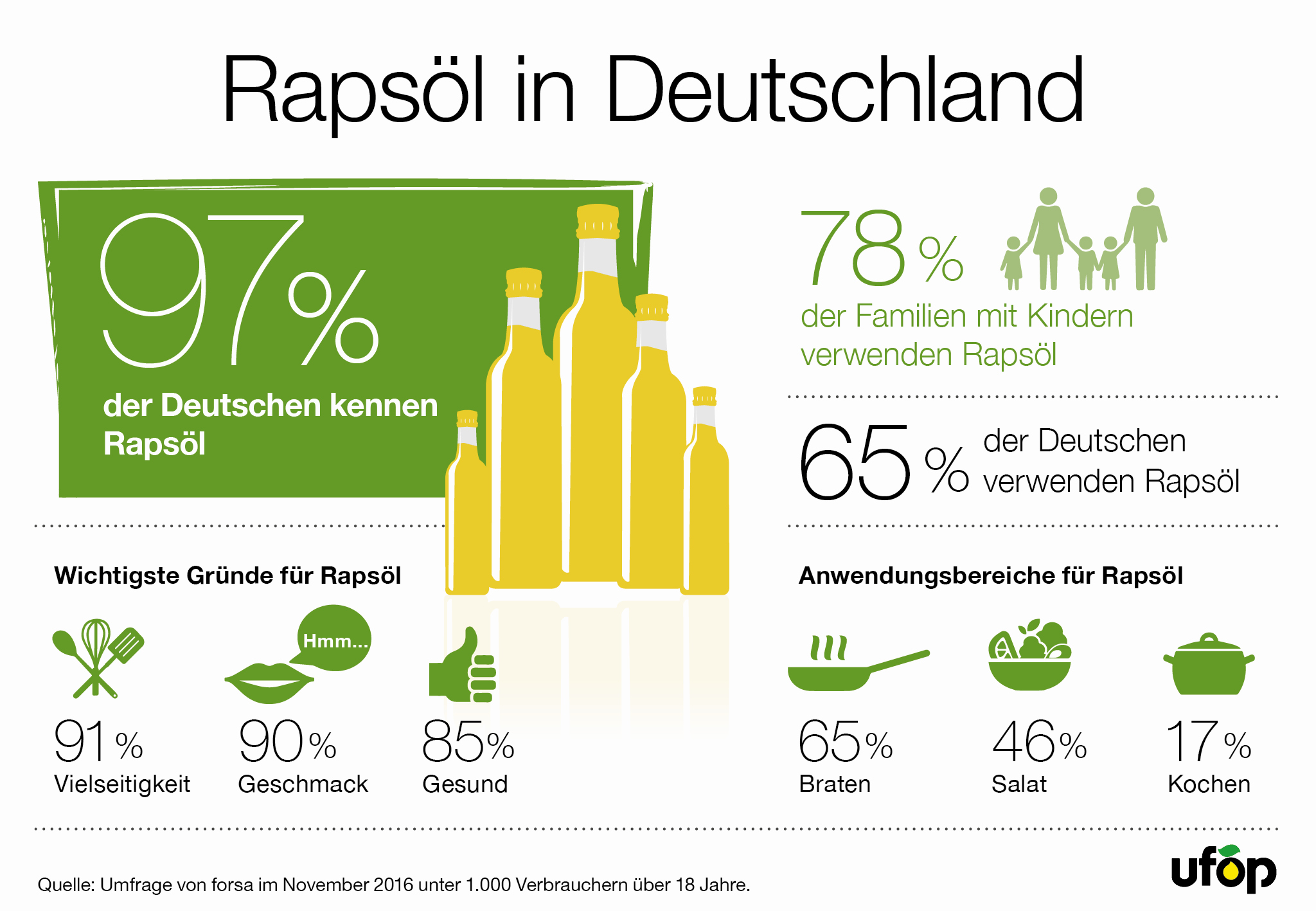 Laut einer forsa-Umfrage zählt Rapsöl zu den bekanntesten Speiseölen in Deutschland. Vor allem Familien verwenden das mengenmäßig wichtigste heimische Pflanzenöl.