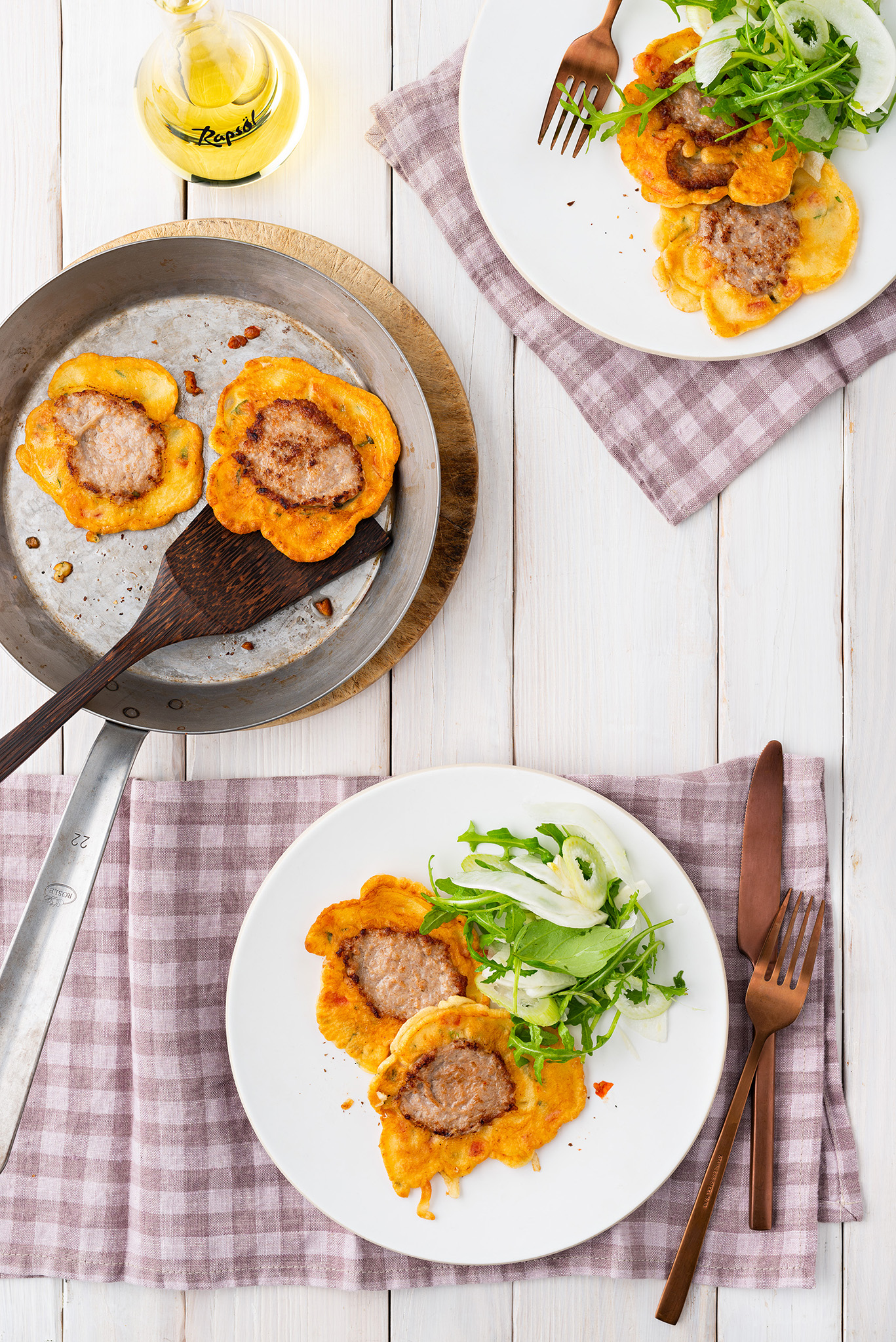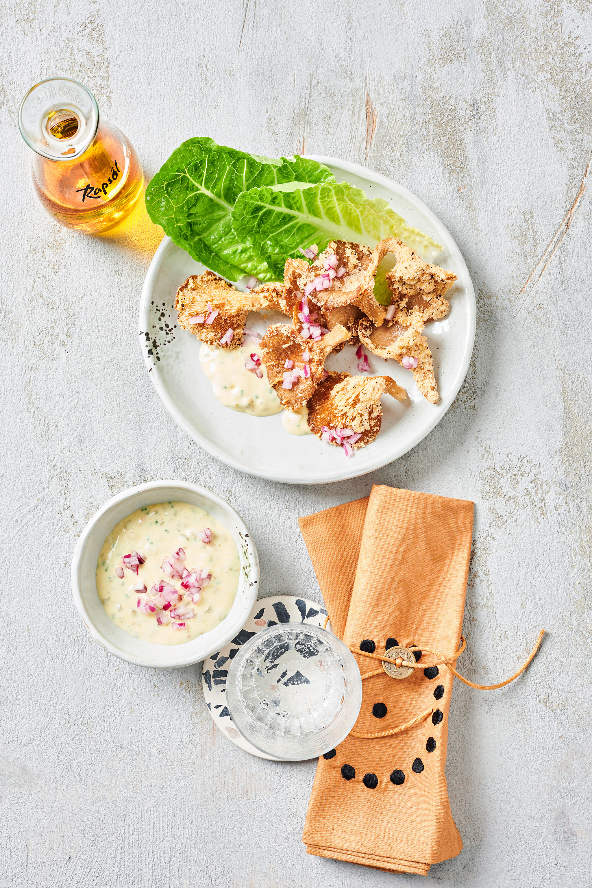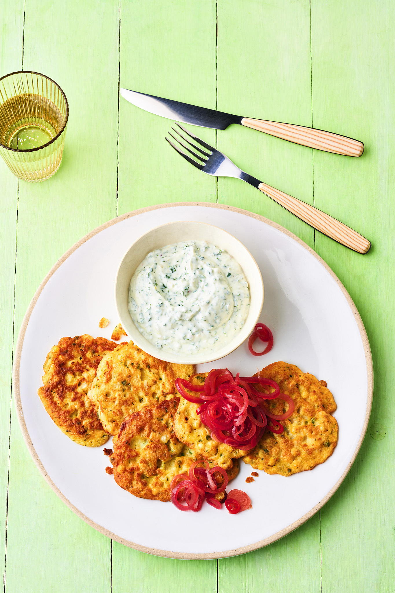 Rezeptidee Mai 2023: Körnererbsen-Puffer mit Estragon-Senf-Dip und Essig-Zwiebeln
