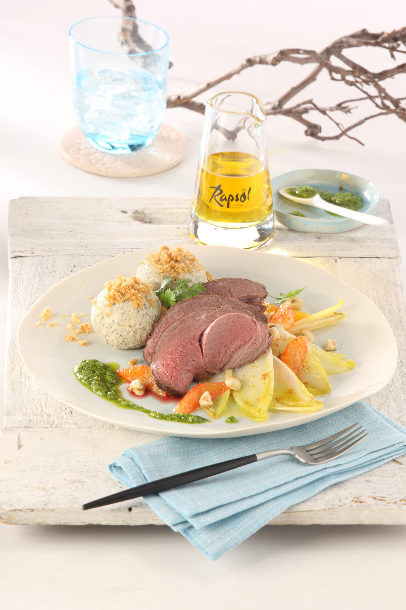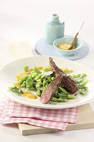 Rezeptidee August 2014: Gebratene Lammfilets mit Möhren-Walnuss-Pesto auf Bohnen