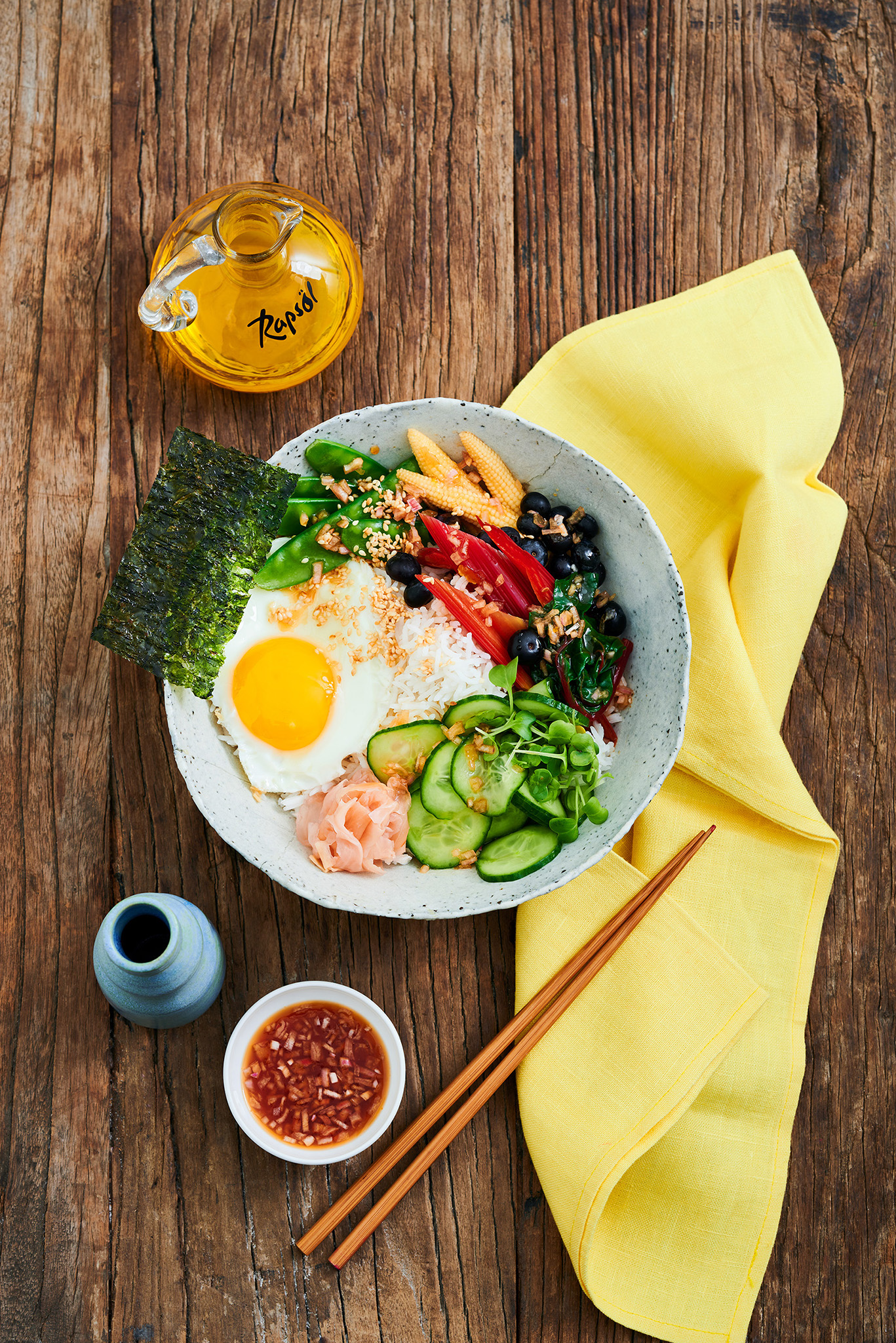 Rezeptidee Juni 2022: Veggie-Bowl mit Rapsöl-Vinaigrette im Yuzu-Style Zutaten für