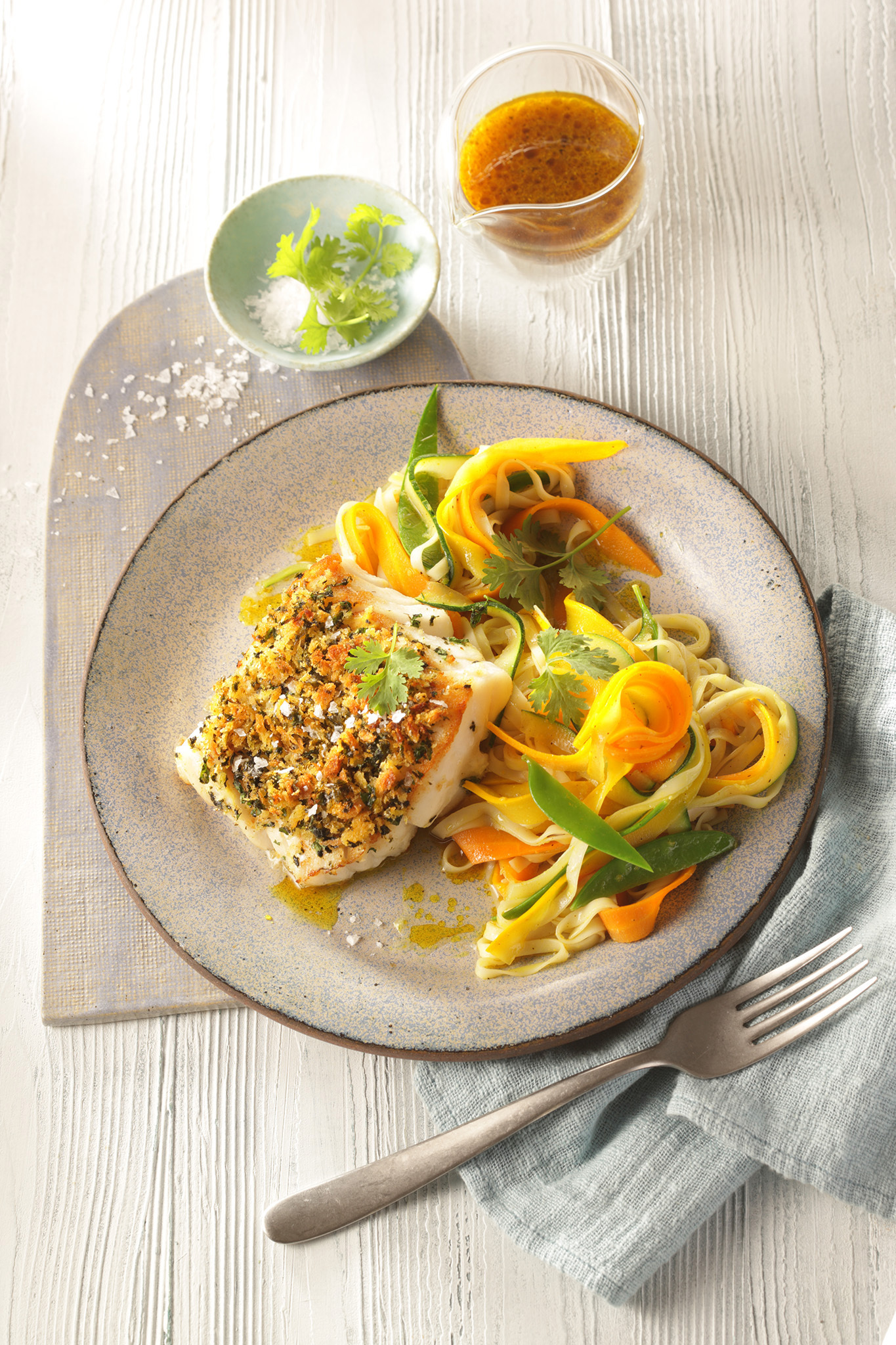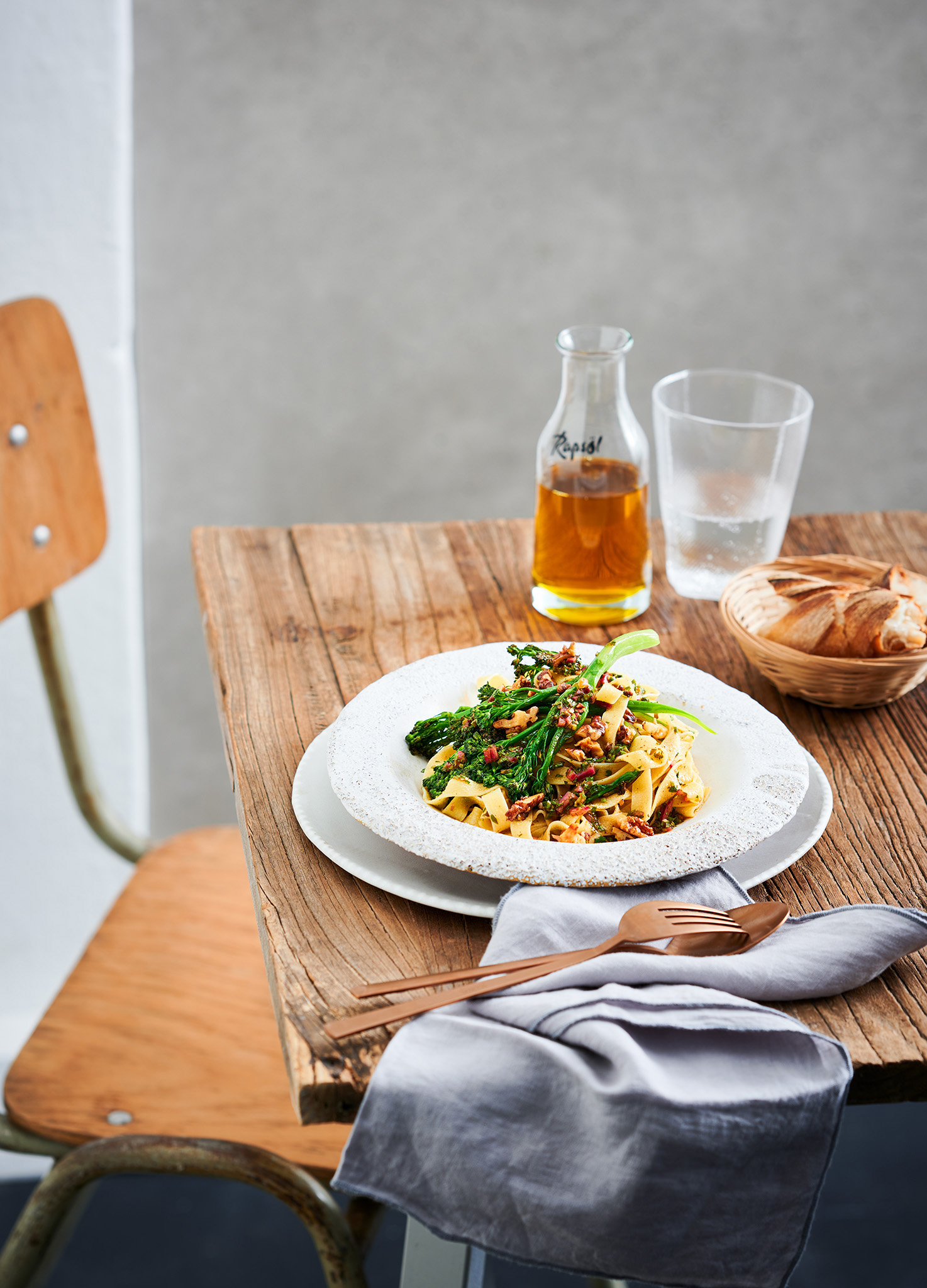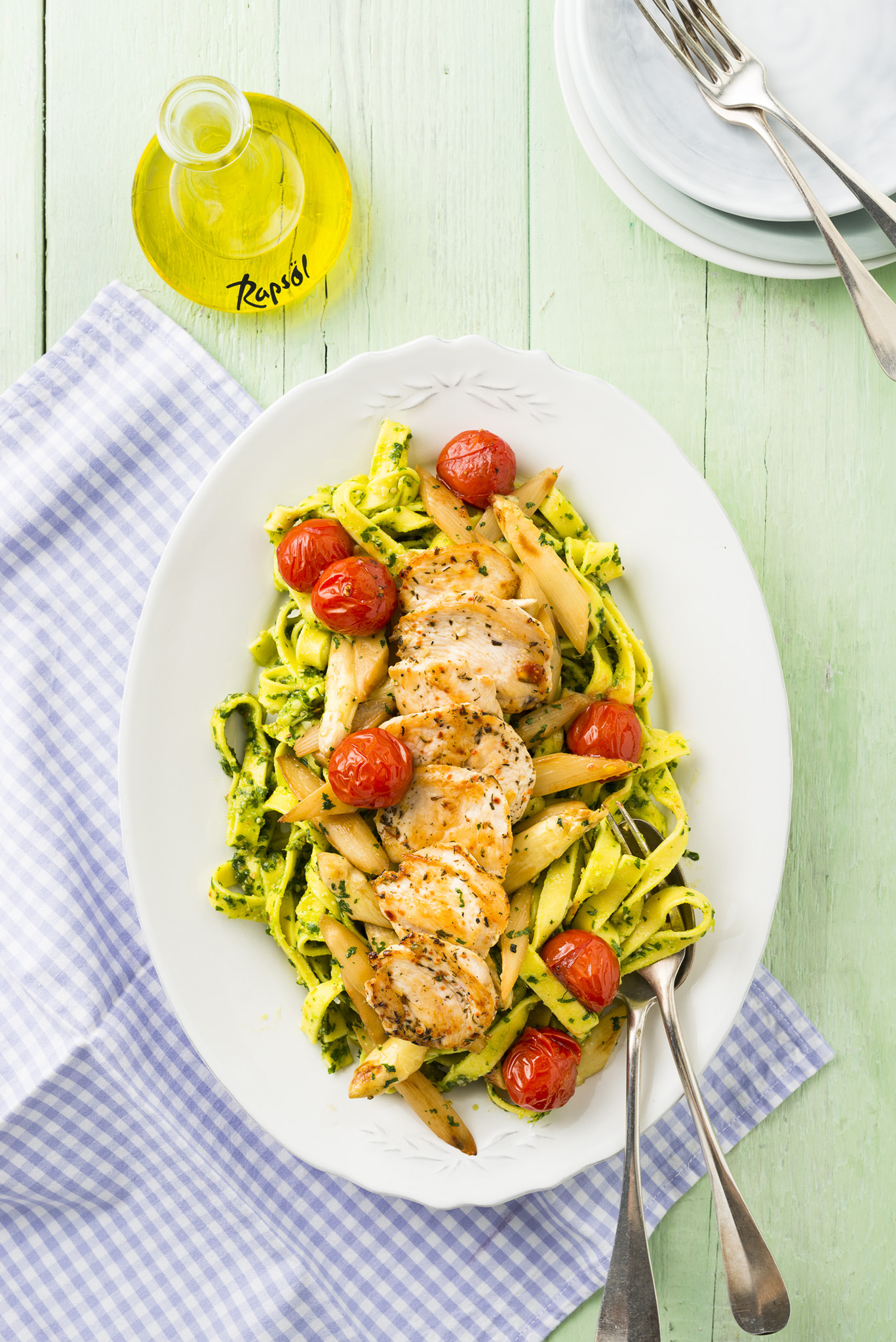 Rezeptidee Juli 2022: Tagliatelle mit Chimichurri-Rapsöl-Sauce und Spargelbrokkoli