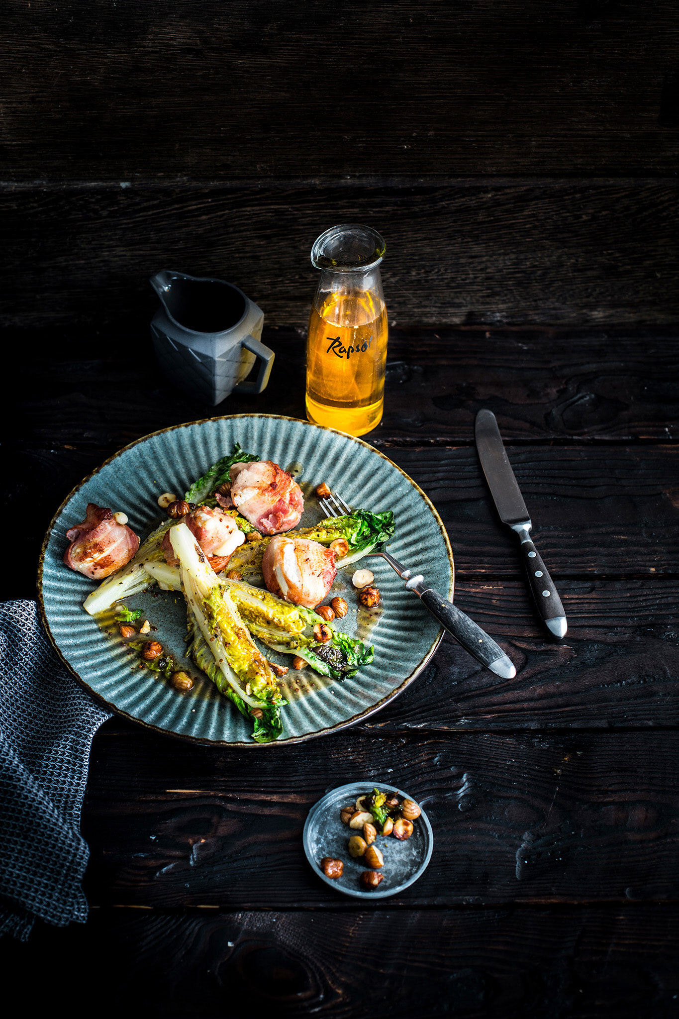 Rezeptidee November 2022: Gebratener Romanasalat mit Camembert im Speckmantel und Rapsöl-Johannisbeerdressing