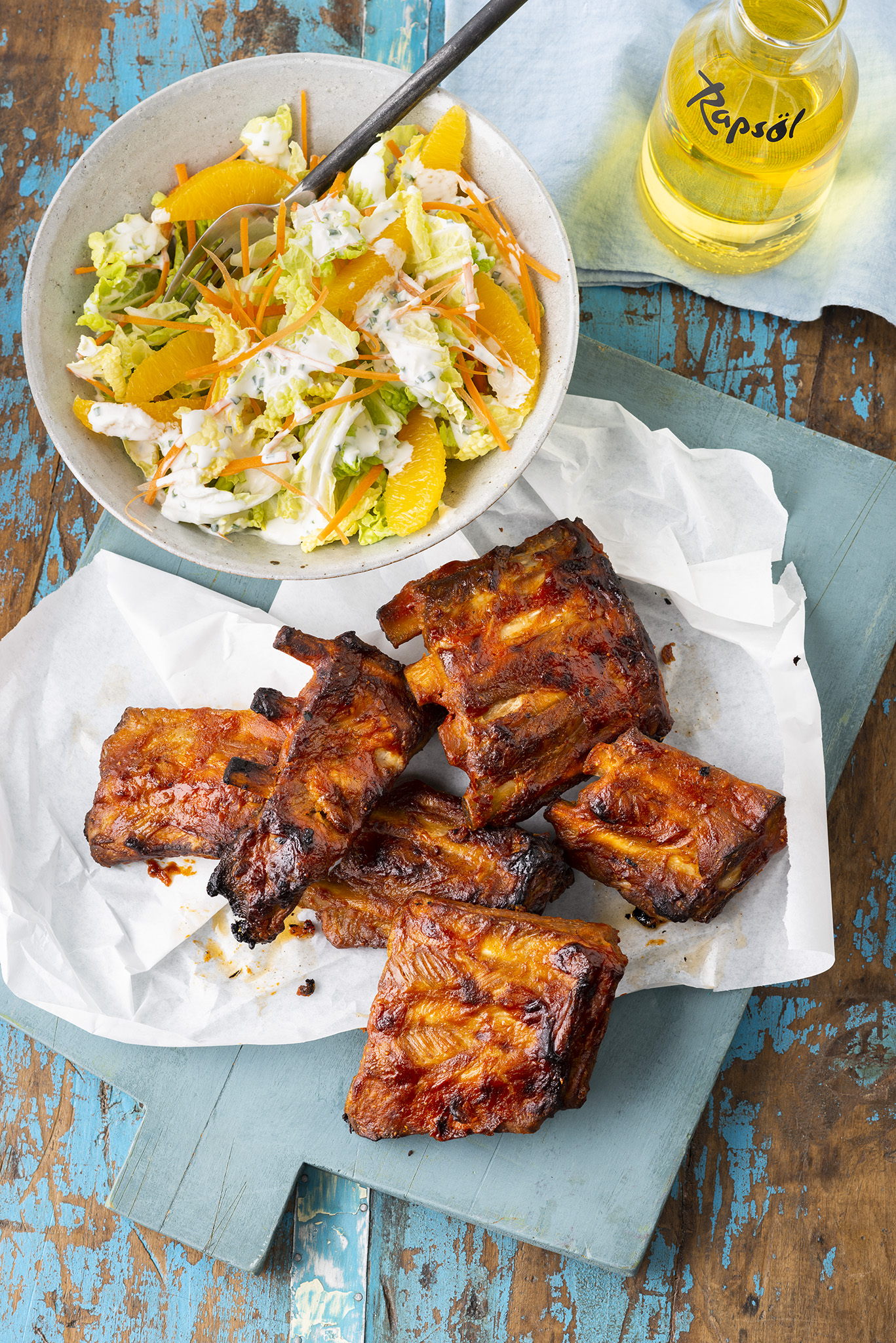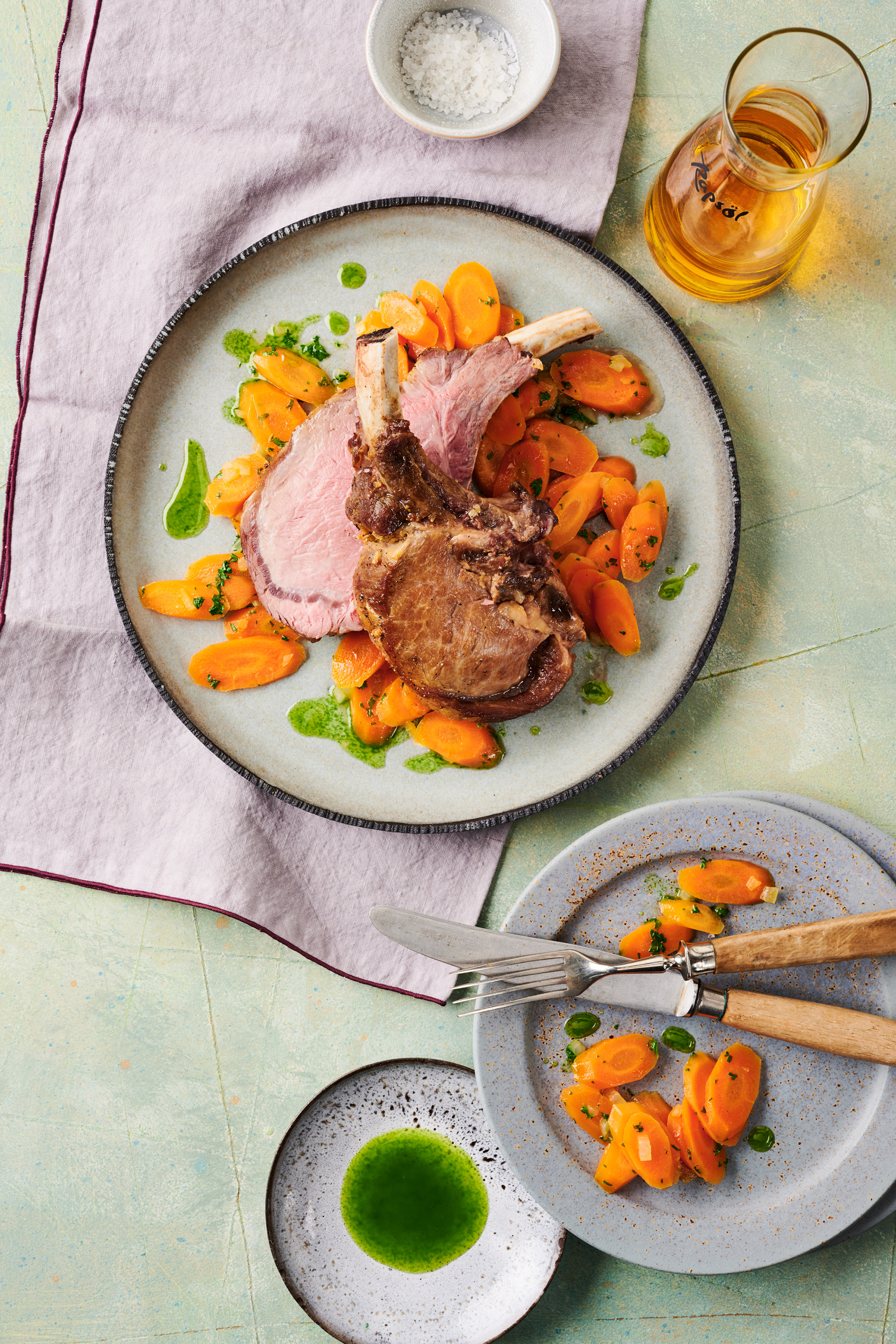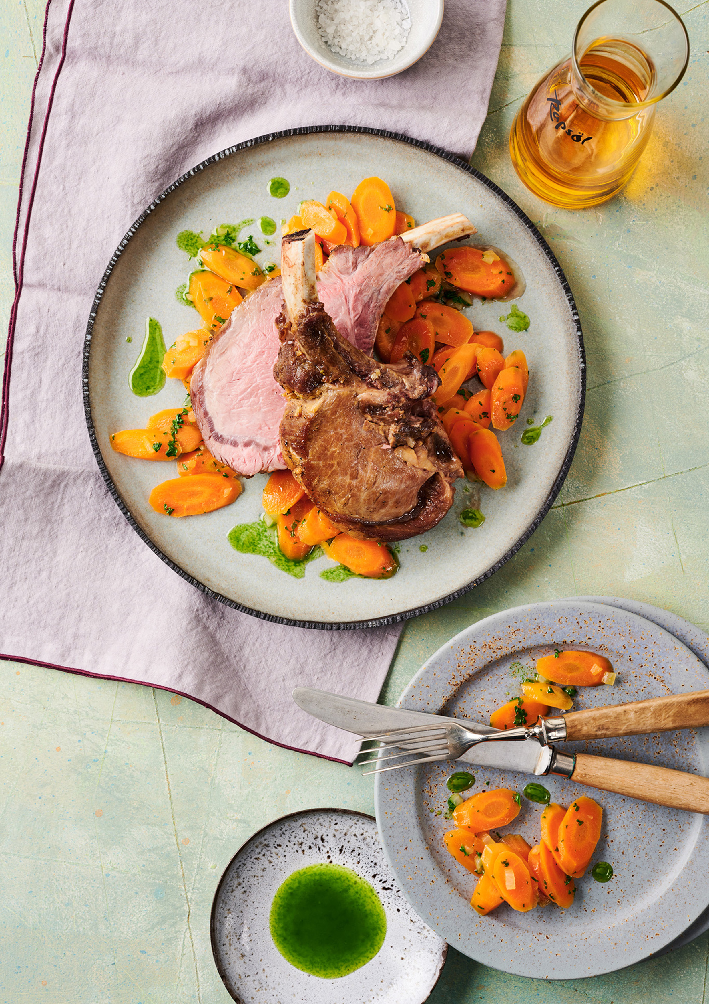 Rezeptidee August 2024: Kotelett für Zwei mit Möhren und Kräuter-Rapsöl