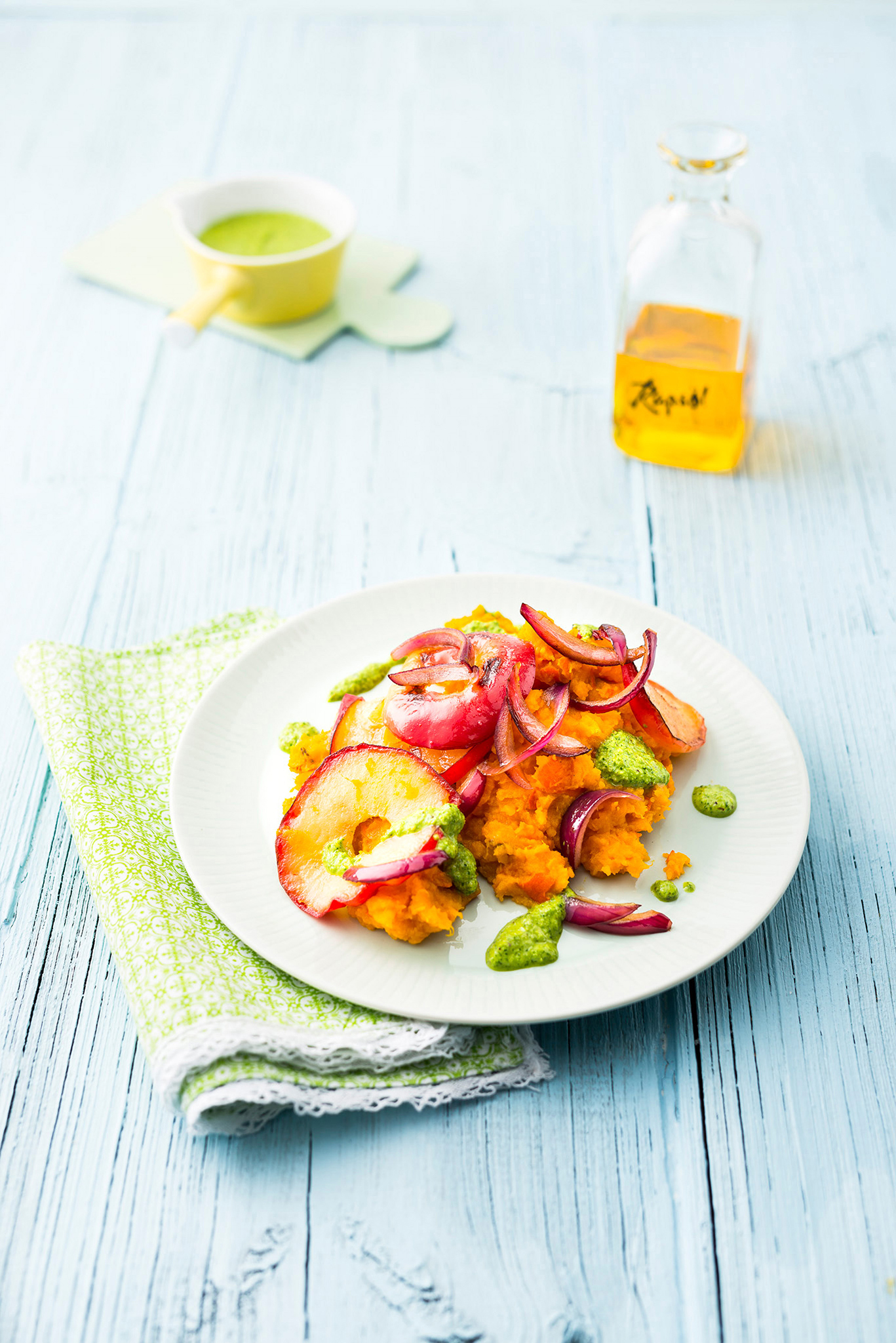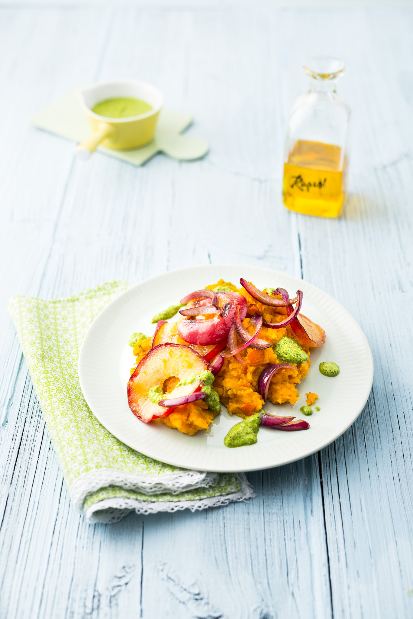 Rezeptidee Januar 2025: Kürbisstampf mit Apfel-Zwiebelgemüse und Petersilien-Pesto