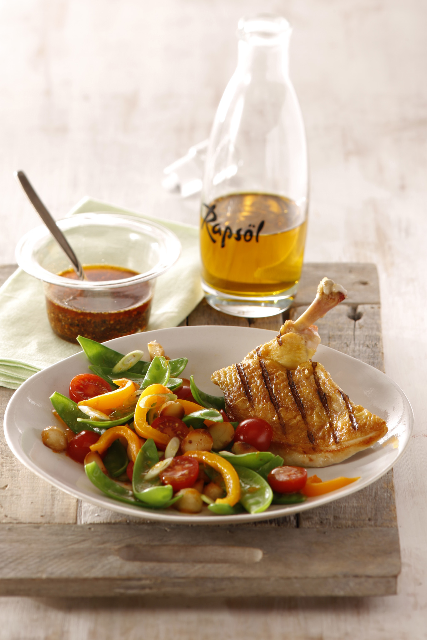 Rezeptidee Juli 2013: Gegrillte Maispoulardenbrust in Cajun-Gewürzöl auf Zuckerschoten-Salat