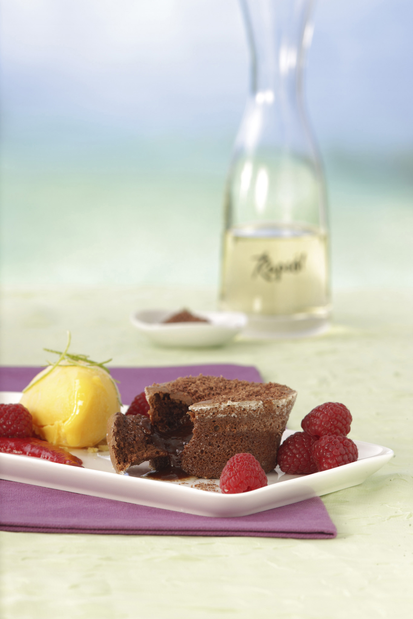Rezeptidee Juni 2013: Schokoküchlein mit Himbeeren und Mango-Sorbet