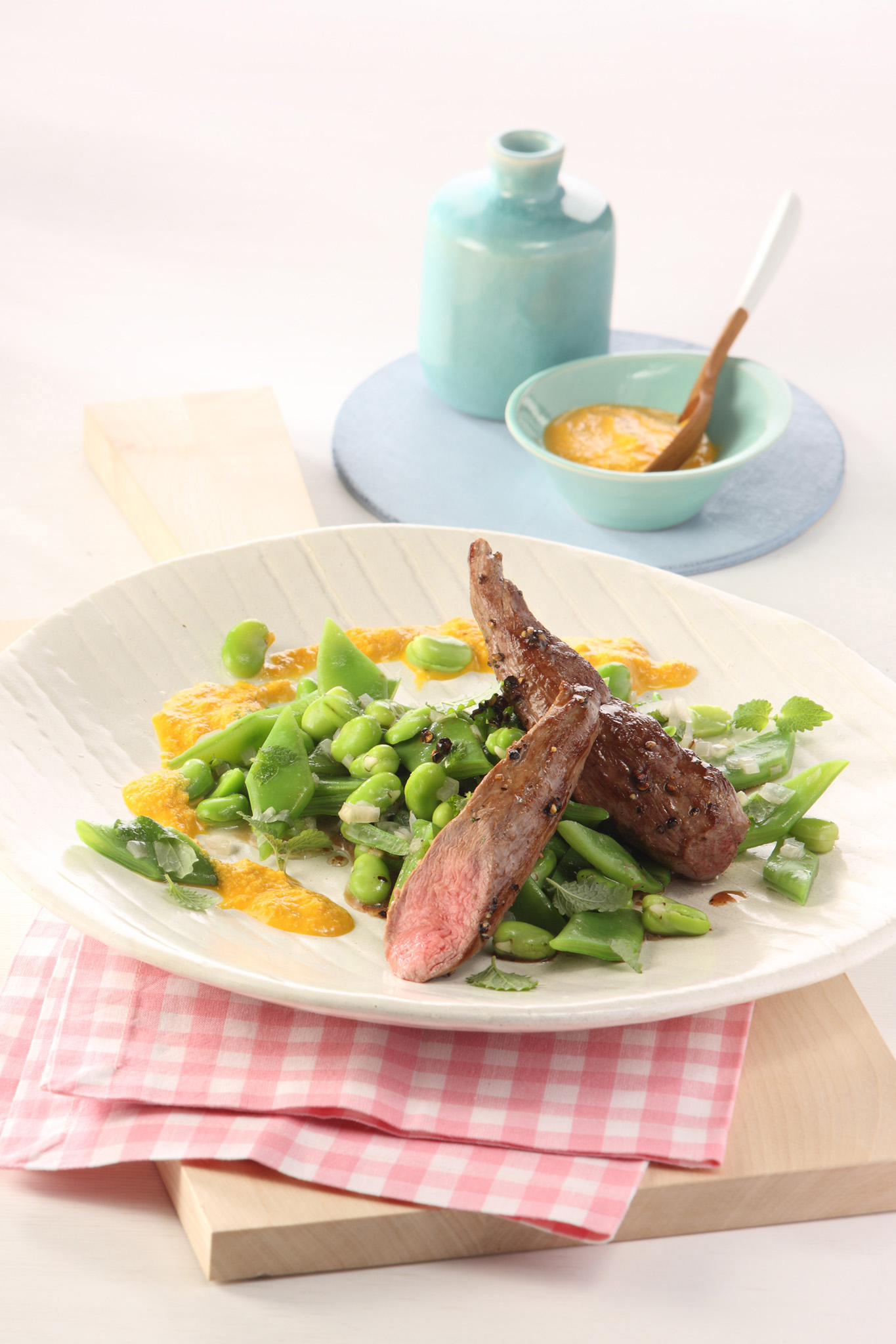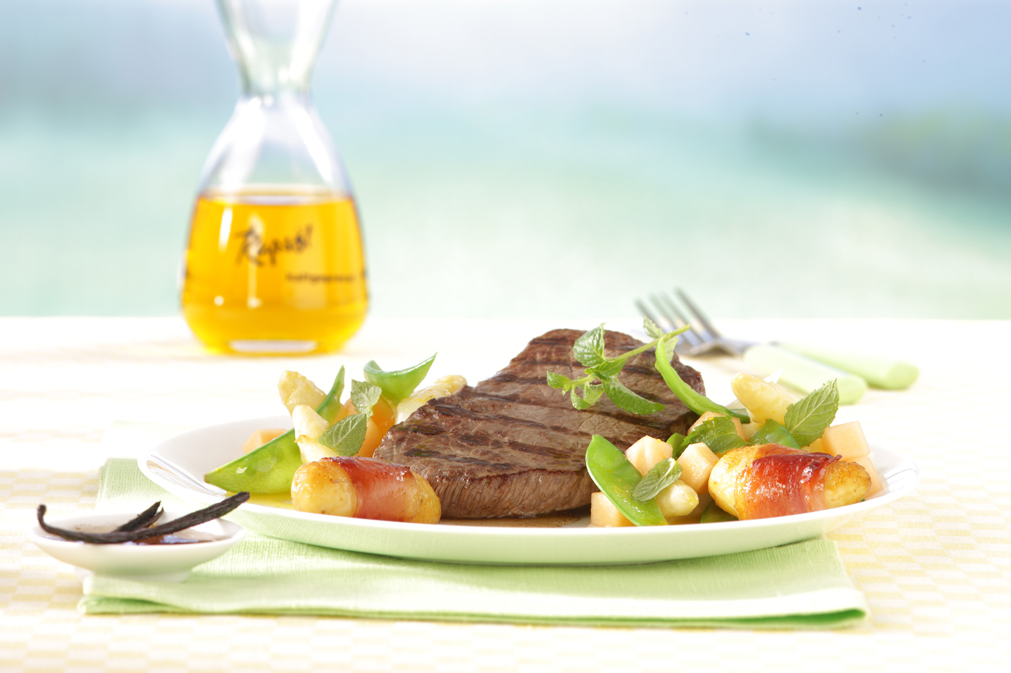 Rezeptidee Mai 2013: Gegrilltes Jungrindsteak mit Vanilleöl und Spargel-Melonensalat