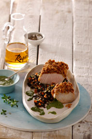 Rezeptidee September 2013: Spanferkelbraten auf schwarzem Linsengemüse mit Zitronenthymian-Pesto