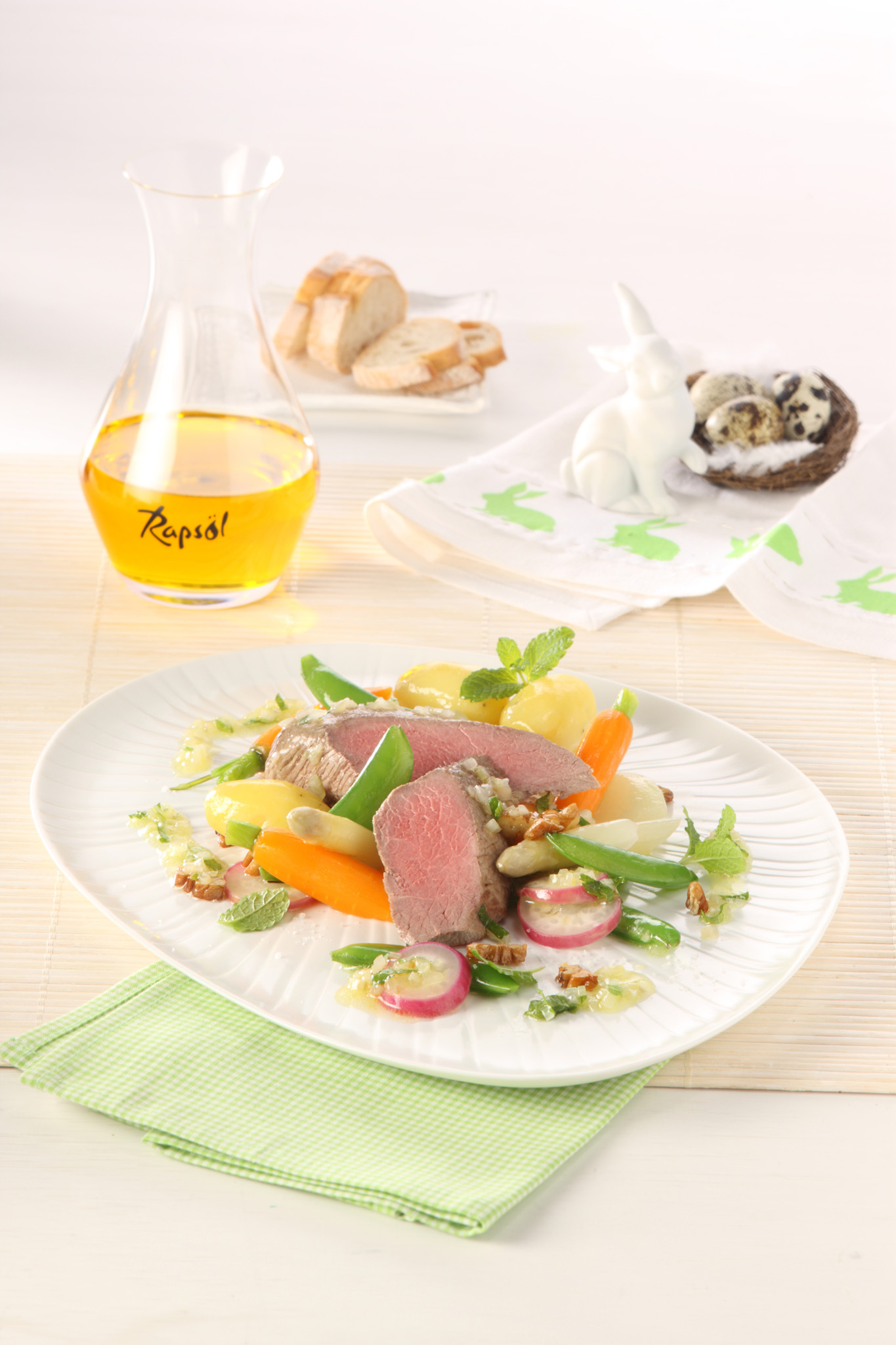 Rezeptidee April 2014: Pochiertes Lammrückenfilet mit lauwarmer Minz-Vinaigrette auf Frühlingsgemüse