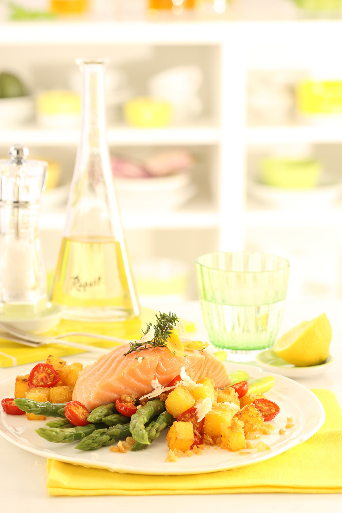 Rezeptidee Mai 2014: Confiertes Lachsfilet auf grünem Spargel mit Knusper-Kartoffelwürfeln