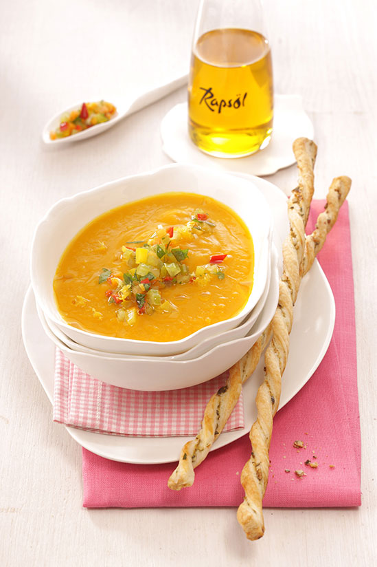 Rezeptidee September 2014: Kürbiscremesuppe mit Gemüsegremolata und Blätterteigstangen