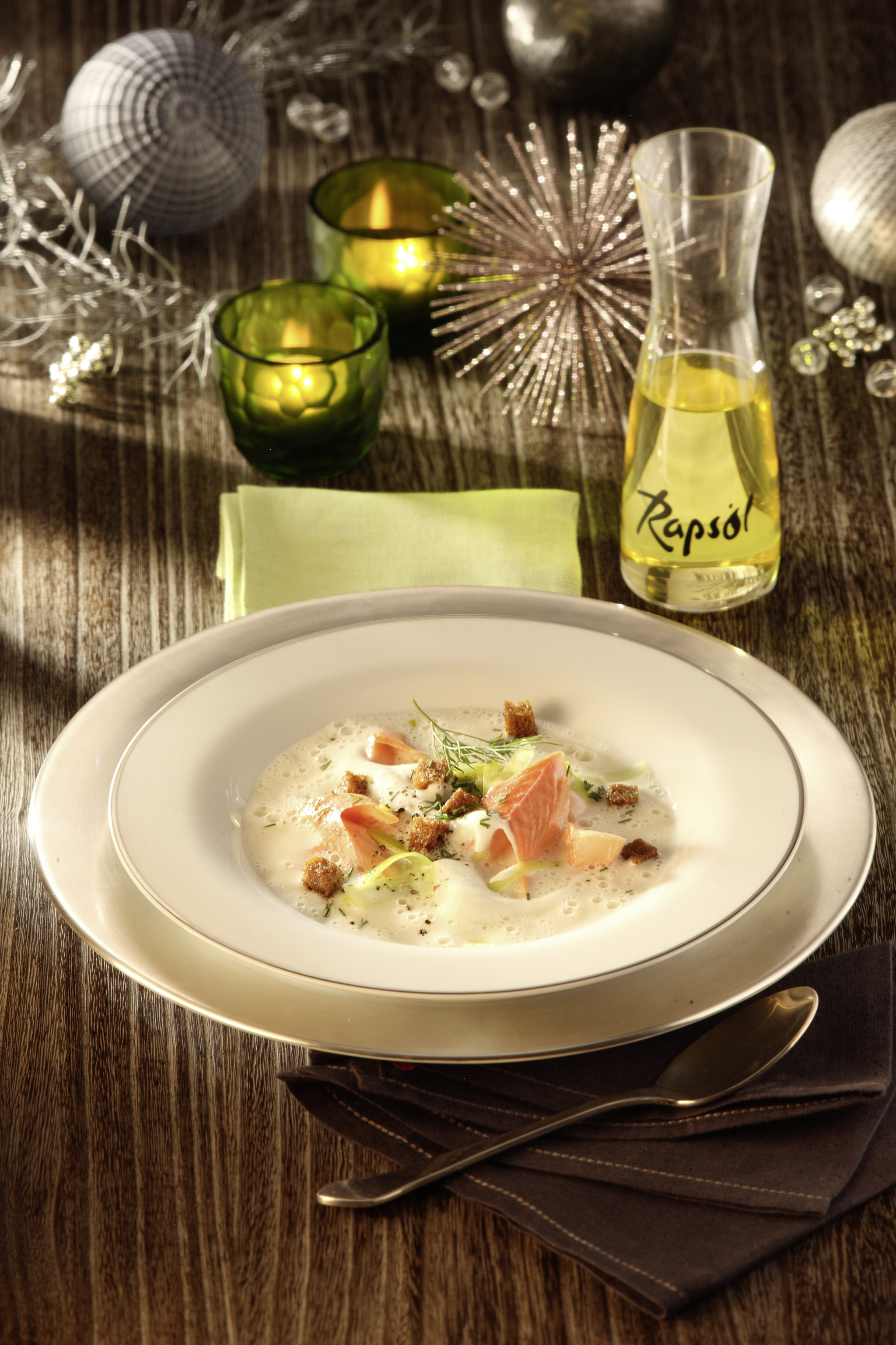 Rezeptidee Dezember 2014: Räucherforellensuppe mit Lauch und Schwarzbrot-Croûtons